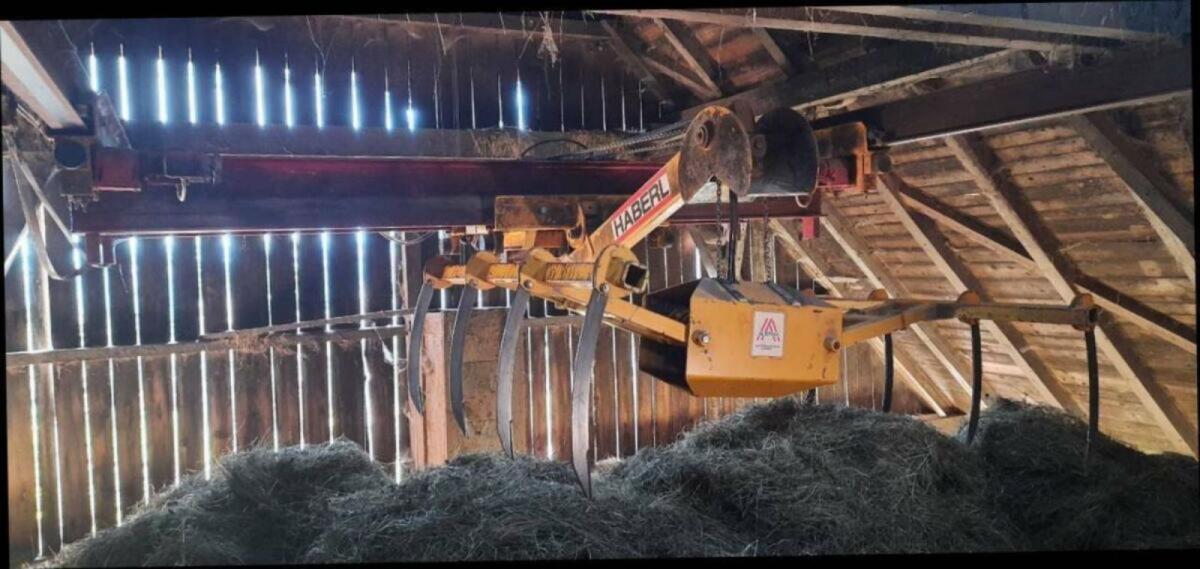Verkaufe Heukran Marke 'Haberl', Ausführung als Hänge-Brückenkran mit Doppelkettenhubwerk (Hubgeschwindigkeit bis zu 35 m/min), hydr. Schoppeinrichtung, Kreuzhebel-Fernsteuerung kabelgebunden, Tragkraft bis 600 kg, Geschwindigkeit Längsfahrt bis 70 m/min, Verfahrweg individuell anpassbar mit I-Träger IPE220 (I-Träger nicht im Angebotsumfang), Spurbreite 3,8 m, Geschwindigkeit Querkatze bis 45 m/min, Verfahrweg 2,64 m, Zangenbreite 1,5 m (mit Verbreiterungen ca. 2,5 m). Kran ist abgebaut.