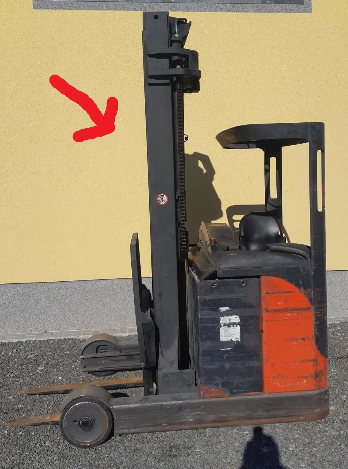 Hubgerüst von Stapler Linde R 20, verkauft wird nur das Hubgerüst, Hubhöhe: 6.700mm, Freihub, Bauhöhe: 3.000mm, Gabellänge: 1.000mm, Seitenschieber, gebraucht. Preis € 600,-.