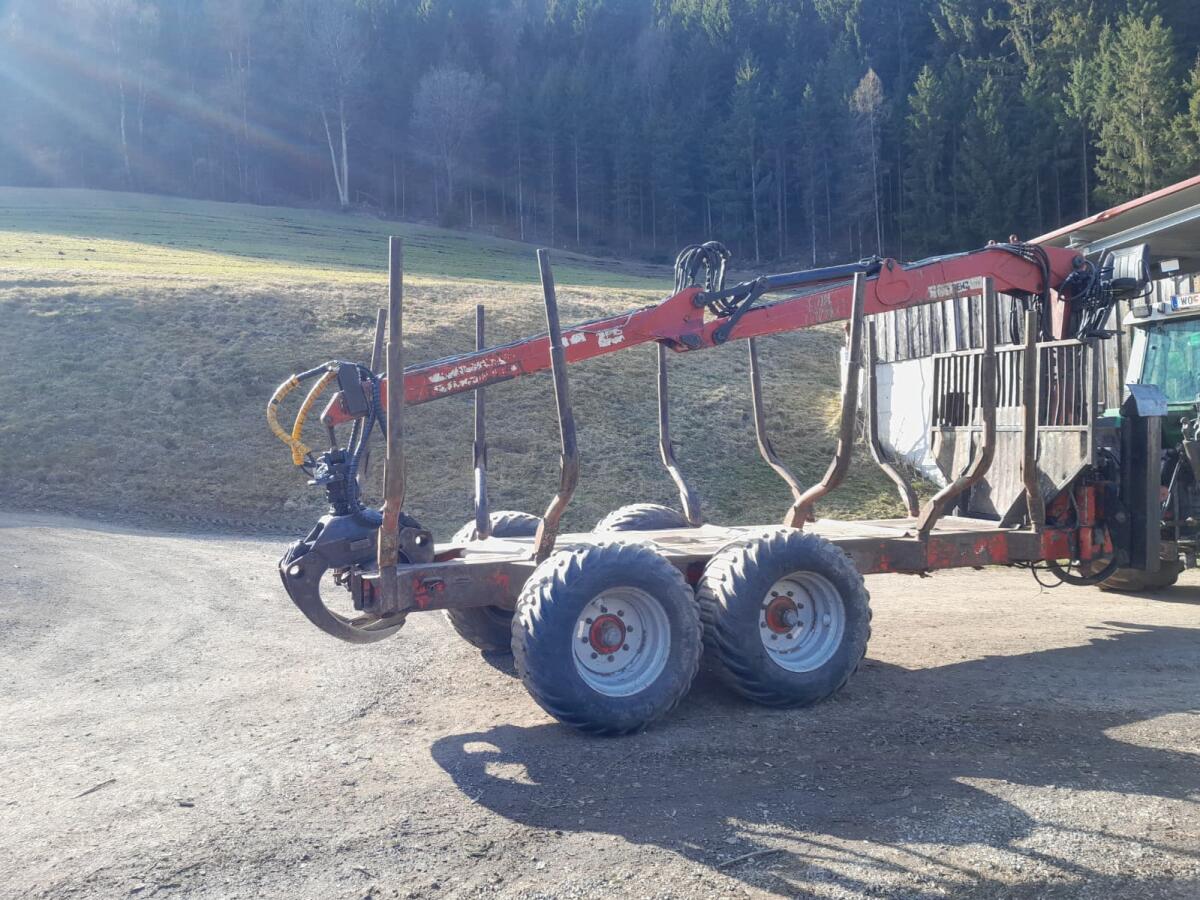 Rückewagen (Eigenbau) mit ca. 10-12 Festmeter Ladevolumen, Penz-Kran 5.75H mit 7,5m Reichweite, Eigenölversorgung, mechanische Steuerung, Hochsitz, Flap-Down-Stützen, hydr. Stützzylinder, Druckluftbremse (derzeit nicht in Betrieb), ca. 5t Leergewicht.