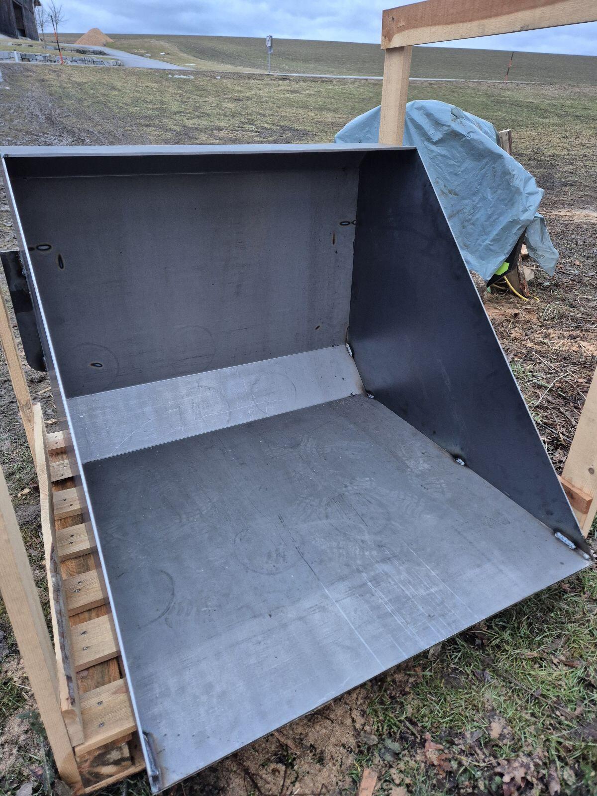 Ich biete hier meine Eigenbau-Hofladerschaufel mit Euroaufnahme an. Breite 100 cm, Höhe 80 cm, Tiefe 100 cm, Seitenwand 4 mm, Schaufel 6 mm. Bei Fragen bitte melden.