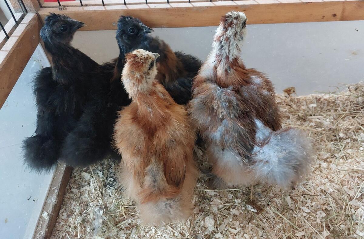 5 Stk. Seidenhuhn Küken, 6 Wochen alt. 1× gelb, 1× rot und 3× schwarz mit Kupfer. Preis pro Küken € 15,-. Bei Abnahme aller 5 Küken € 50,-.