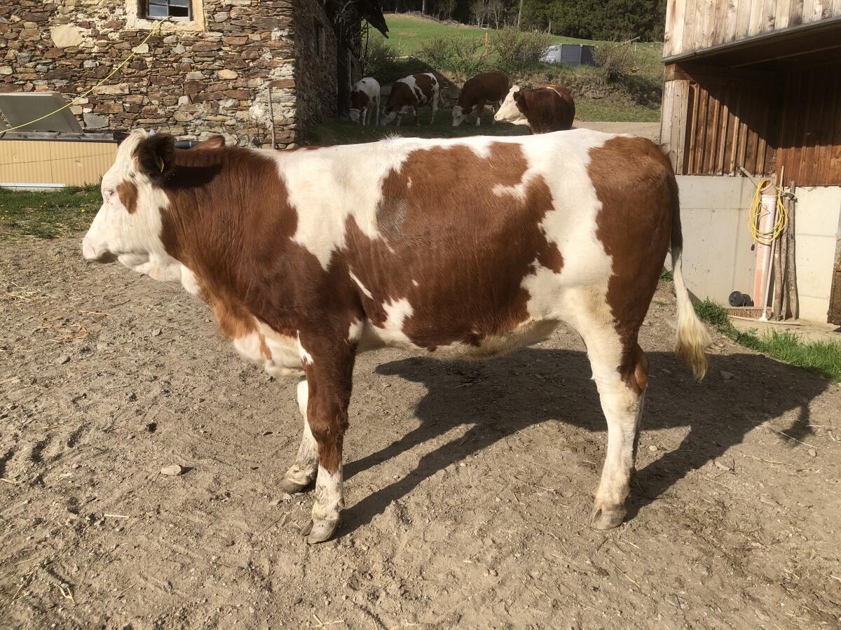 Verkaufe trächtige Fleckvieh Kalbin, Laufstall, Weide, silofreie Fütterung, Abkalbetermin: 4.7.2026.