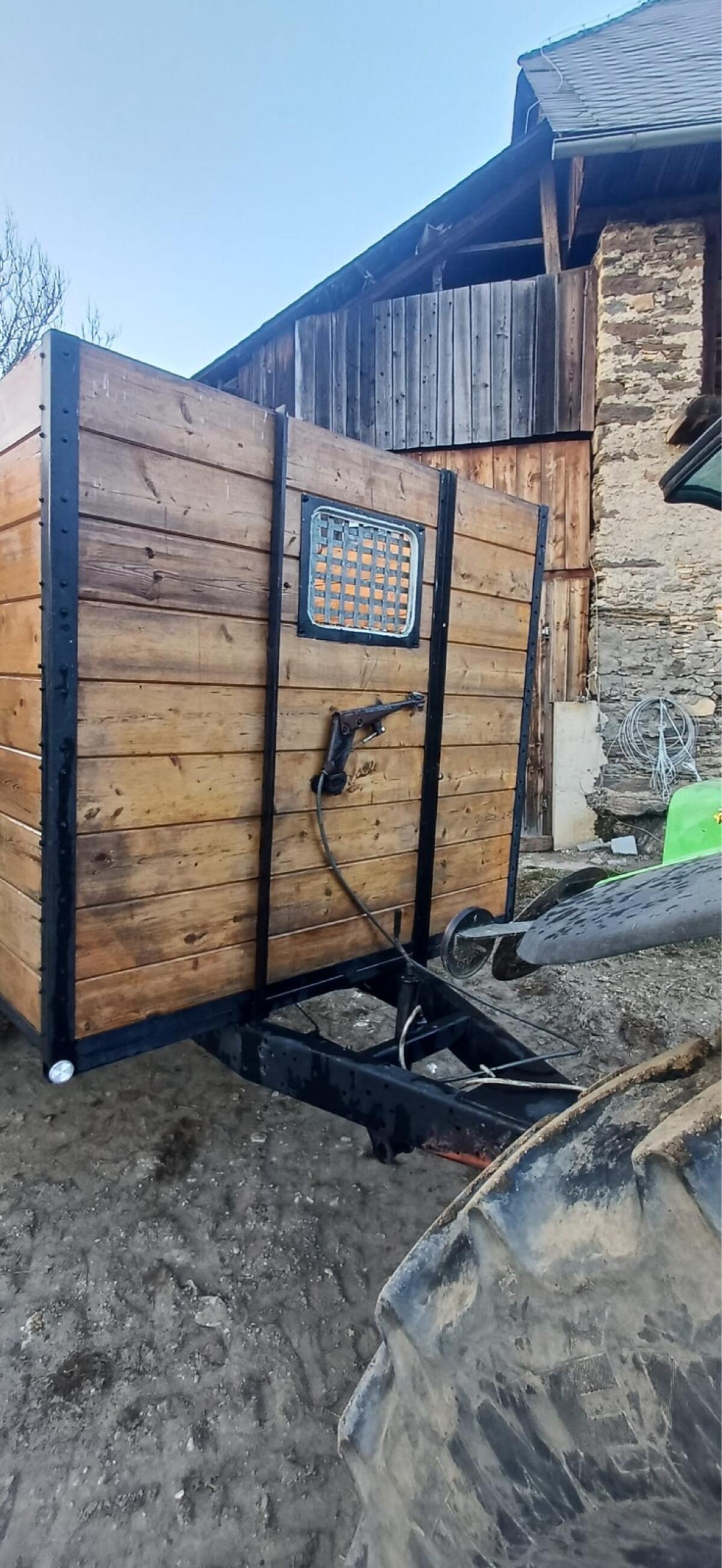Maße: Länge 3 m, Breite 2 m, Plateauhöhe 1,70 m, Gesamthöhe 2,40 m. Gute Bereifung, starke, gebremste Achse, Boden aus Lärchenpfosten, sauber und immer unter Dach eingestellt. Sicherer Betrieb ab 50 PS Traktor. Standort: Bezirk Murau.