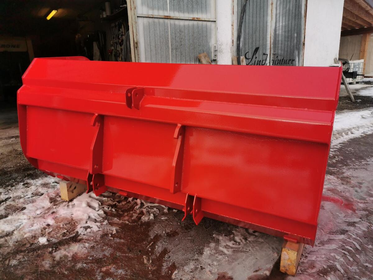 2,4 m Breite. Weidemann-Aufnahme und Dreipunkt Kat 2. Ausführung in Stahlgüte S355. Seitenwände aus 5 mm Stahl, Versteifungen aus 8 mm Stahl. Aufnahme aus 25 mm Stahl. Verschleißschiene aus HB 500, 150 × 20 mm. Oberfläche grundiert und lackiert.