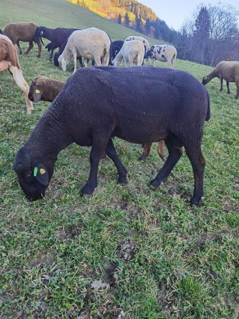 Verkaufe 1 Jura Mutterschaf mit 1 Bocklamm (Herbst 2025). Sie ist fit und vital, sollte nur aufgrund ihrer problematischen Drillingsgeburt nicht mehr als Zuchtschaf
