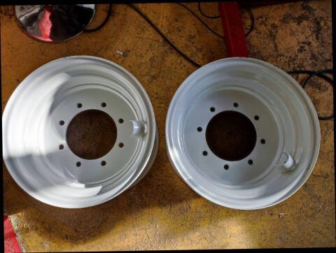 Pflegefelgen Steyr 8-Loch vorne 38" x 10, hinten 54" x 10 für 320/95 R 54 oder 270/95 R 54, passend für 9100 Serie, ET 300 mm, für Spur 225 cm, für Kartoffel und Rüb