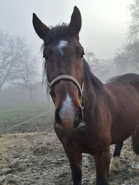 Verkaufe 4-jährige Stute, 'Lora', aus Zeitmangel, stammt aus der Vulkan-Linie, aus schlechter Haltung übernommen und aufgefüttert, ca. 165 cm Stockmaß, kennt Offenst