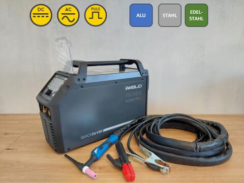 WIG Schweißgerät für anspruchsvolles Schweißen von Edelstahl und Aluminium. Ausstattung: Lift Arc und HF Zündung, 2 Takt / 4 Takt, WIG AC / DC mit Pulsfunktion, 3 AC