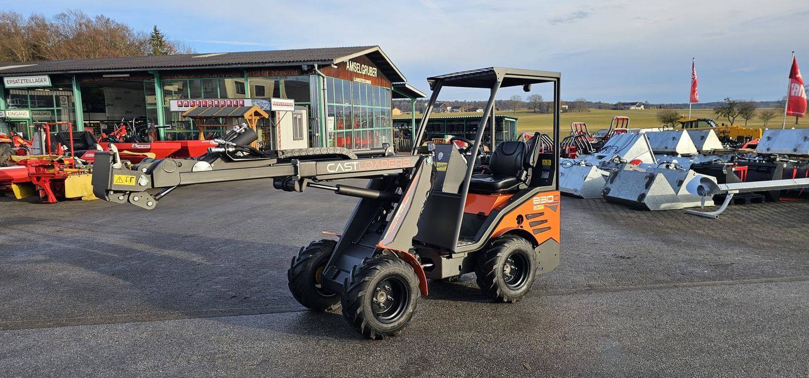 Neumaschine mit 295cm Hubhöhe, Teleskoparm, 42 lt./min Hydraulikleistung und 20 km/h Fahrgeschwindigkeit! mit Poclain Radmotoren Der neue CAST 830 D setzt neue Maßstäbe am Hofladermarkt. Maximale Leistung bei geringsten Abmessungen und größter Wendigkeit und Übersicht. Diese technischen Daten sollten Sie vergleichen: -Bauhöhe unter 200 cm -Baulänge: 257 cm -Hubhöhe 296 cm! -Mit Tandempumpe! Per Knopfdruck kann eine zweite Hydraulikpumpe zugeschaltet werden, für die doppelte Hydraulikleistung bei gleicher Motordrehzahl -HYDRAULIKLEISTUNG: 42 lt./min (Ideal für starke Anbaugeräte wie Schneefräsen, Mulcher, Sichelmähwerke, Kegelspalter, Erdbohrer und über 150 weiteren Anbaugeräten) -Hydrostatischer Allradantrieb -25 PS 3 Zylinder Kubota Baumaschinenmotor. (Diesel) -Teleskop-Hubarm (Größte Hubhöhe und vor allem erhöhte Kipplast durch Verkürzung der Hebelwirkung) -Vollmetallverkleidung (Keine zerbrechlichen Polyester oder Plastik - Motorhauben oder Kotflügel) -Hydraulikölkühler -Unschlagbare Wendigkeit! -Starres Mittelgelenk mit Knicklenkung für MAXIMALE STANDFESTIGKEIT! -Elektrische Differentialsperre (per Knopfdruck zuschaltbar) (Kein durchdrehen der Räder + maximale Traktion und Schubkraft) -Parallelführung -3. Steuerkreis vorne (1xDW + Druckloser Rücklauf - 3 Hydraulikanschlüsse) -Steckdose schaltbar vorne -Arbeitsscheinwerfer LED -Hubkraft: 1.100 Kg -Kipplast: 850 Kg -Fahrerschutzdach (optional auch mit Winterdienstkabine mit Heizung erhältlich) -Beste Qualität - Nur Top- Komponenten führender Hersteller. (Das Produktionswerk ist nur gut 3,5 Stunden von Tarsdorf entfernt, gerne ist auch eine Werksbesichtigung möglich!) -Werkzeugschnellwechsler mit Universalaufnahme (Es passen alle Anbaugeräte von Castloaders, Workyquad, Avant, Multione, Norcar uvm.) Die Maschine kann nach Absprache jederzeit besichtigt und Probe gefahren werden. Bis zu 7 Jahre Zahlungsziel. Wir beraten Sie gerne!
