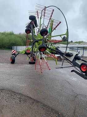 Zweikreiselschwader für Seitenablage Bügelanhängung an den Unterlenkern, Kat. II Antrieb 540 U/min Arbeitsbreite 8,05 m 2 Schwadkreisel mit je 3,80 m Durchmesser 14 Zinkenträger je Kreisel 4 Doppelfederzinken je Zinkenträger CLAAS Silagezinken Ø 9,5 mm, unten um 10° angewinkelt Kreisel: Schwadglocke, hermetisch geschlossen Sphäroguss-Kurvenbahn, Laufrollen (kugelgelagert) und Zinkenarmlagerung im Ölbad laufend Kreiselführung vollkardanisch, dreidimensionale Bodenanpassung PROFIX Zinkenträger: Doppelwandig mit integrierter Sollbiegestelle Steckverbindung mit Vielfachverzahnung Bügelsicherung PROFIX Werkzeuglos austauschbar Transportfahrwerk bis 40 km/h, aktiv gelenkt 4-Rad-Kreiselfahrwerke mit Bereifung 16x6.50-8 Zinkenverlustsicherung, integriert Schutzbügel, klappbar Schwadtuch Hydrauliksteckergriffstücke Kennfixx Warntafeln mit Beleuchtung Transportmaße: Höhe 3,99 m (mit Zinkenträgern), Breite 2,99 m Hydraulikvoraussetzungen: 1 x dw und 1 x ew Gewicht: ca. 2.590 kg Optional: Bereifung: 15/55-17 Schwadtuchklappung, hydraulisch Erweiterung auf 6-Rad-Fahrwerk Ersatzrad mit Halterung 16x6.5-8