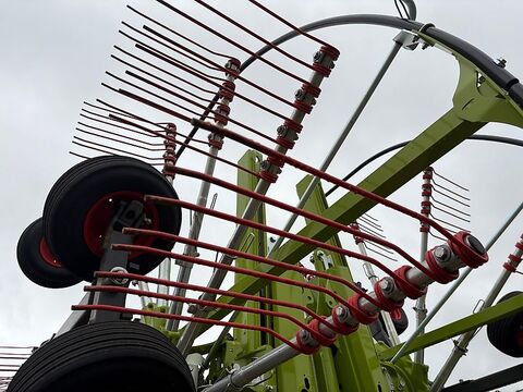 CLAAS LINER 4700 BUSINESS Vierkreiselschwader für Mittenablage Bügelanhängung an den Unterlenkern, Kat. II Antrieb 540 U/min Arbeitsbreite 9,30 m - 12,70 m, hydraulisch stufenlos verstellbar Schwadbreitenverstellung, hydraulisch 4 Schwadkreisel mit je 3,30 m Durchmesser 12 Zinkenträgern je Kreisel 4 Doppelfederzinken je Zinkenträger CLAAS Silagezinken Ø 9,5 mm, unten um 10° angewinkelt Hauptrahmen: Trapezförmig aus hochfestem Stahl Kernkomponenten (Hydraulik und Elektronik) im Hauptrahmen integriert Patentierter Doppelteleskopausleger mit C-Profil, vorne Einzelteleskopierung Kreisel: Schwadglocke, hermetisch geschlossen Sphäroguss-Kurvenbahn, Laufrollen (kugelgelagert) und Zinkenarmlagerung Antrieb mechanisch mit integrierter Reibkupplung Patentierte Kreiselführung über Doppelfeder Kreiselführung vollkardanisch, dreidimensionale Bodenanpassung Kreiselhöhenverstellung, mechanisch (MHV) PROFIX Zinkenträger: Doppelwandig mit integrierter Sollbiegestelle Steckverbindung mit Vielfachverzahnung Bügelsicherung PROFIX Werkzeuglos austauschbar Komforthydraulik Transportfahrwerk hydraulisch absenkbar, bis 40 km/h Zinkenverlustsicherung, integriert Schutzbügel Stützfuß, halbautomatisch Hydrauliksteckergriffstücke Kennfixx Warntafeln mit Beleuchtung, schwenkbar Transportmaße: Höhe 3,99 m (mit Zinkenträgern), Breite 3,00 m Gewicht: ca. 5.080 kg Komforthydraulik Vierkreiselschwader: Dauerölumlauf, Load-Sensing fähig Zweikreiselschwader: Vorwahlbedienung CEMIS 10, Traktorsteuergeräte Achse mit Bremse Bereifung 600/50 R22.5 8-Loch Druckluftbremsanlage 4-Rad-Kreiselfahrwerk ISOBUS-Kabel, ohne Terminal [+] Freischaltung Section Control [+] Arbeitsbeleuchtung LED 6 Stück [+] Schwadtuch [+] Halterung für Ersatzzinkenträger Für 6x rechts und 6x links Zinkenträger