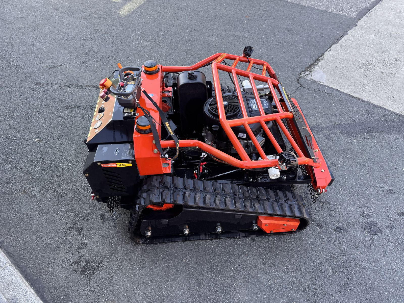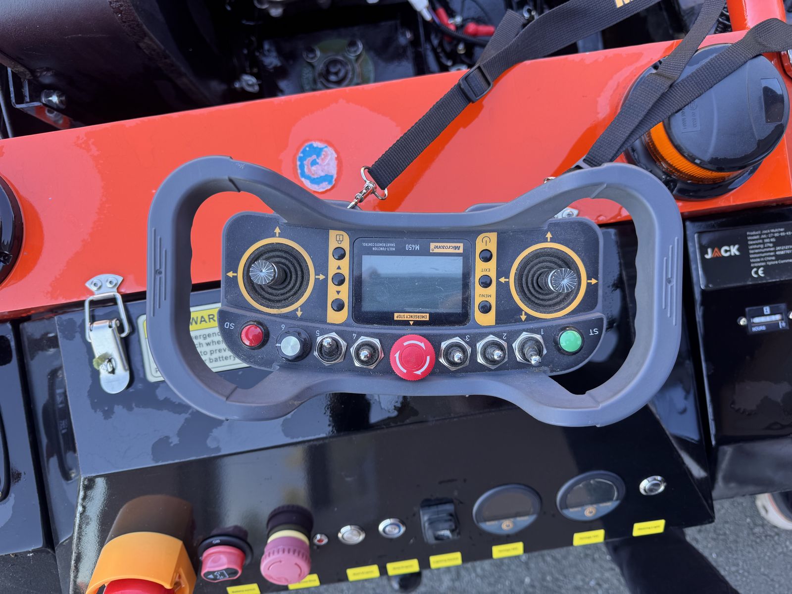 Sicherheit: Not-Aus, automatische Abschaltung bei Funkverlust, Kettenvorhang, Funkfernbedienung