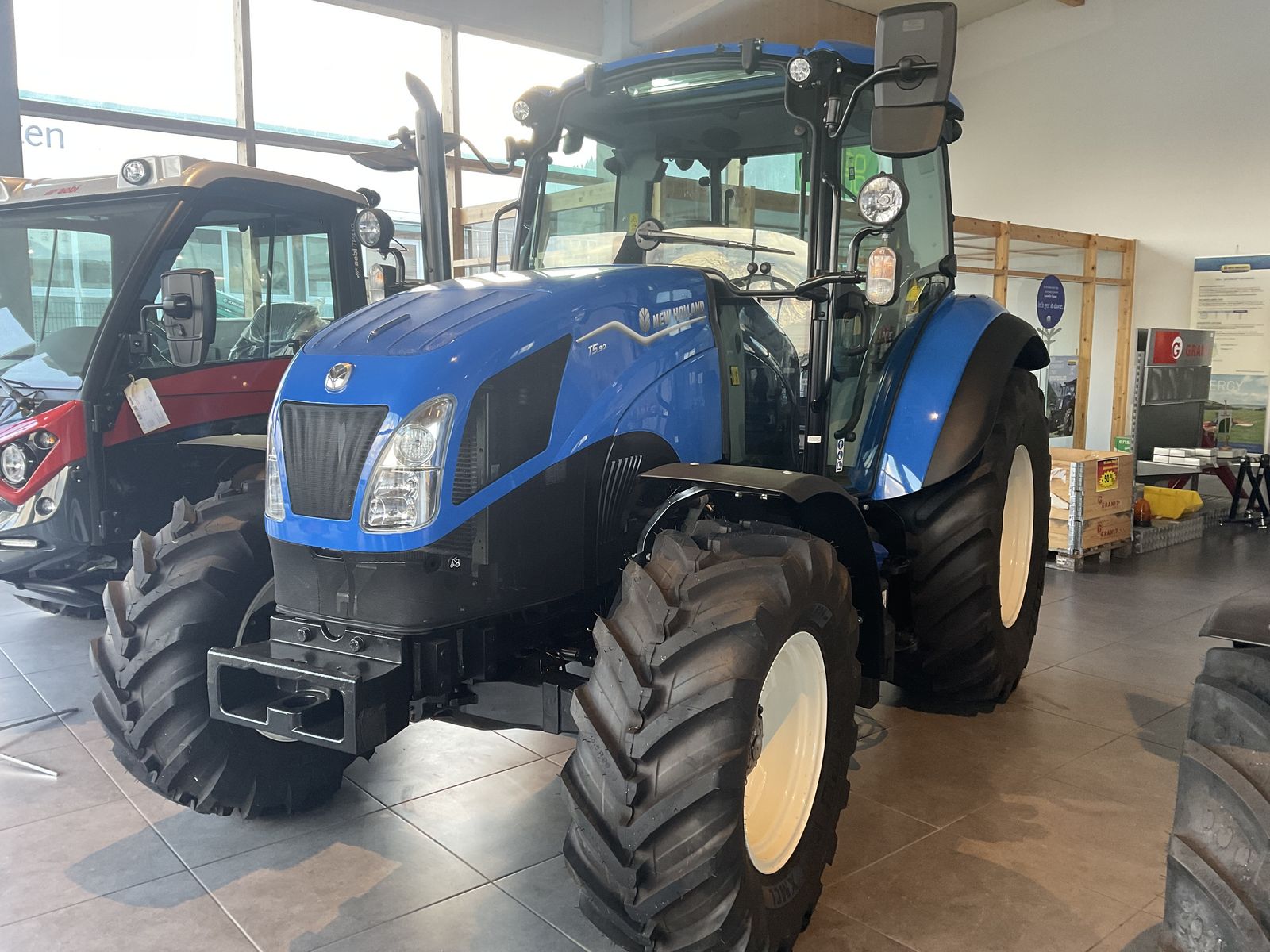 Neuer New Holland Traktor T 5.90: mit Heizung, Kabine, 12/12 Powershuttle Getriebe, Luftfedersitz, hydraulische Anhängebremsventil, Bereifung 380/75 - 20, 540/65 - 28. NEUMASCHINE.