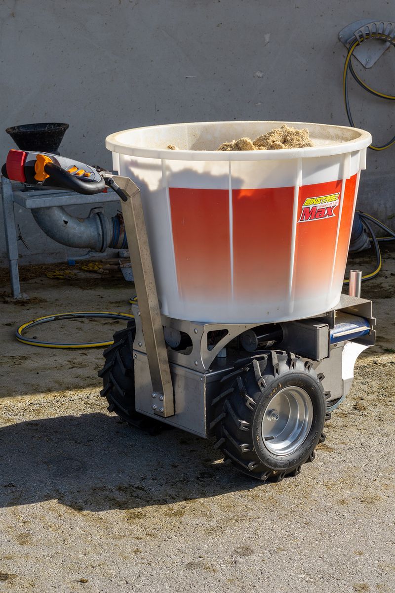 200l Behälter Geschwindigkeit des Förderbandes stufenlos verstellbar mit Förderband & Rührwerk, mit Differenzialgetriebe und direktgeflanschten 24V 800 Watt Motor. Gesamter Aufbau in Edelstahl, Höhenverstellbarer, ergonomischer Deichselkopf mit integrierter Körperschutztaste und langer Deichsel sowie Schieberegler zur Vorwahl der Arbeitsgeschwindigkeit. Akkuanzeige im Deichselrohr, breiter AS-Bereifung und 2x Multicontroller I-Drive, sowie 2 wartungsfreien AGM-Akkus 12V 40AH und einem geregeltem Ladegerät 24V. Wandhalterung für Ladegerät. Verpackt auf Einwegpalette mit Betriebsanleitung. Einstreugerät , Einstreumaschine , Einstreu , Werkzeugaufnahme nicht enthalten