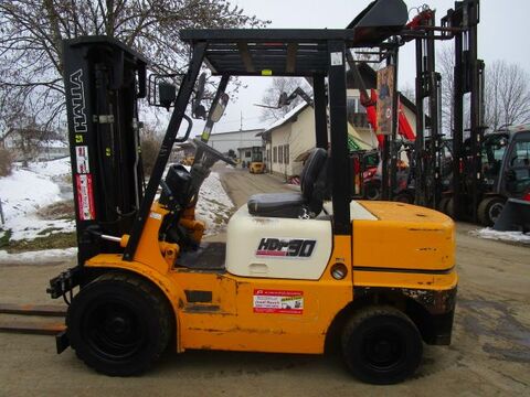 Bauart: Frontstapler / Dieselstapler, Tragkraft: 3000kg, Hubhöhe: 4800mm, Bauhöhe: 2140mm, Bereifung vorne: Vollgummi Einfach 80 - 100% , Bereifung hinten: Vollgummi Einfach 40 - 60% , Anbaugeräte: Seitenschieber, Sonderausstattung: 3. Ventil, Dachabdeckung, Beschreibung: Frontstapler - Dieselstapler HALLA HDF 30 - - 3 Ton. Hubkraft - - - Seitenschieber - - TRIPLEX-Freihubmast - - - Bauhöhe 2,14m -