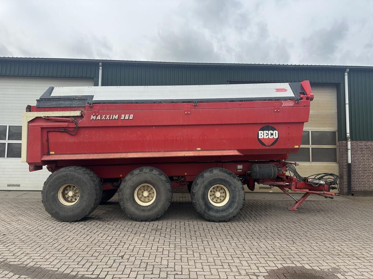 == Overige details (NL) == Beco Maxxim 360 • Banden 24R20.5 • Afmetingen bak 6.500 x 2.300 x 1.300 (LxBxH) • Kunststof mat op bodem en zijkanten • Laadcapiciteit 24 m3 • Dubbelwerkende hydraulische achterklep • Hydraulische afdekluiken (zo goed als nieuw) • Laadvermogen 36000 kg • Triangle unit (type HDO) met BPW assen 150x150 mm • Remmen Ø 410x180 mm • Dubbelleiding luchtremsysteem • Dissel met hydraulische vering • Hydraulische steunvoet • Automatische vetsmering • Kiepcilinder met cardanring • Verlichtingssysteem met ronde LED dubbele verlichting • ALR remkrachtregelaar • Automatisch smeersysteem • K50 koppelingen voor stuursysteem • Elektrische bediening voor het uitlijnen van de besturing • Bediening doormiddel van Tridec bedienings kast • Kipper zo uit het werk! Staat: Gebruikt Bouwjaar: 2014