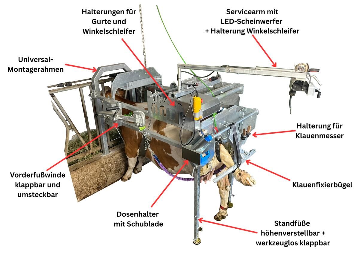 Stressfreie Klauenpflege für Mensch und Tier, Anbau an jedes Selbstfangfressgitter durch Universal-Montagerahmen möglich, komfortable Bedienung mit el. Winde direkt am Stand, professionelle Beinfixierung durch innovatives Gurtsystem, Stand ist immer einsatzbereit, keine Vorbereitungszeit, akute Klauenpflege neben der Stallarbeit, kein zusätzlicher Platzbedarf, Fressplatz steht ungehindert zur Verfügung, wenn Stand in Parkposition, Verkaufspreis gültig bis 31.12.25 (inkl. MwSt.), beinhaltet Stand inkl. fix verbauter Elektrowinde und Montagerahmen zum Fressgitter, Vorderfußwinde, Gurte, Werkzeughalterungen, optional mit Servicearm-Set (Steckdosen, LED-Scheinwerfer, Werkzeugbox) ausrüstbar + 798€