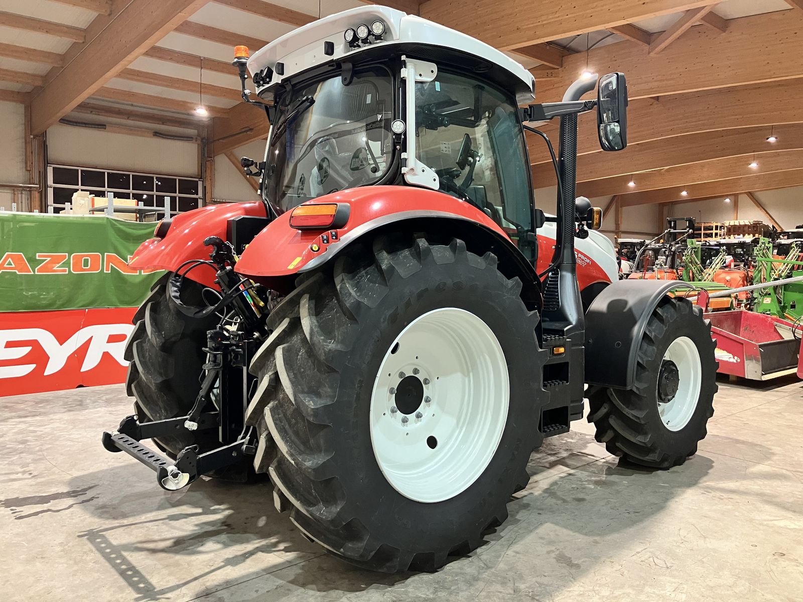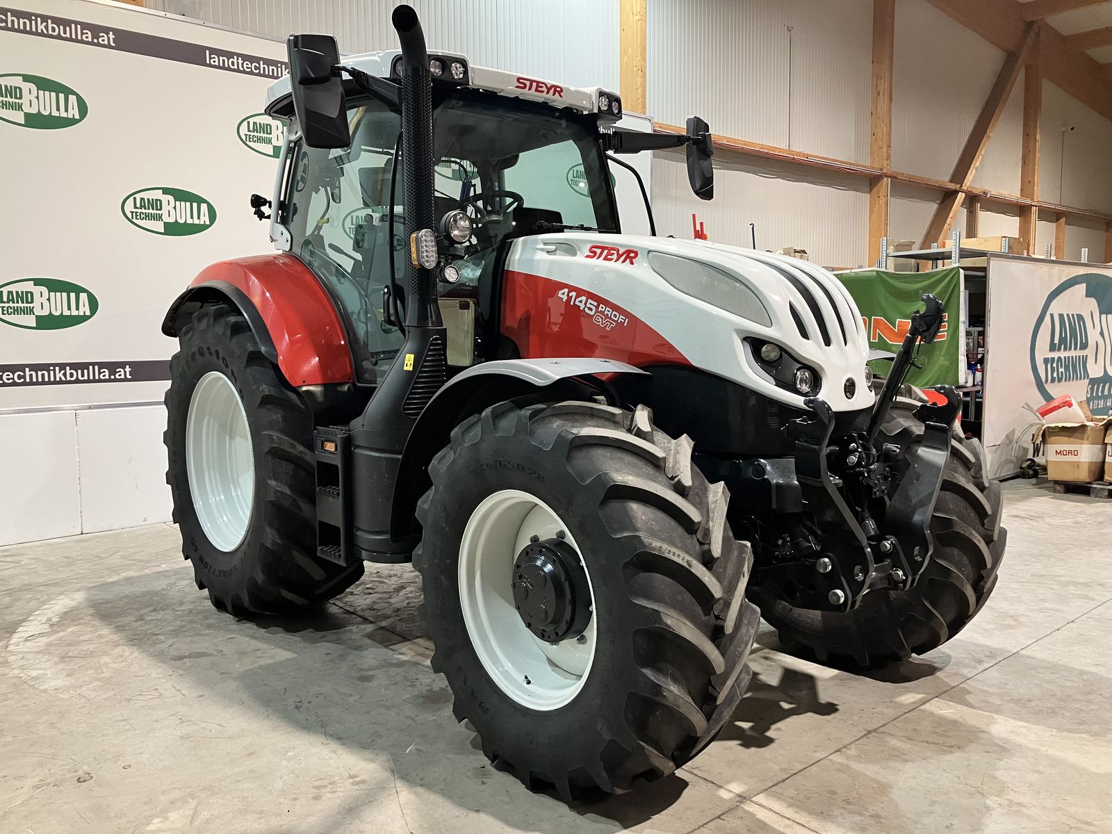 STEYR Profi 4145 CVT + Neumaschine + stufenloses CVT Getriebe + vollautomatische Parkbremse + gefederte und gebremste Vorderachse + Klasse 3.5 Vorderachse, erhöhte Achslast + Kabinenfederung pneumatisch + Bereifung hinten 650/65 R 38 und vorne 540/65 R 28 + Kotflügelverbreiterung + originales Fronthubwerk mit Außentaster für Hubwerk und Steuergerät + 2 Leitungen nach vorne + Frontelektrik am Fronthubwerk + Multicontroller Armlehne mit integrierten Kreuzhebel und V/R Schaltung + elektrische Armlehnenverstellung + Allrad-Zapfwellen- Sperrenautomatik + Motordrehzahlspeicher + S-Tech 700 Plus Monitor + Vorgewendemanagement Easy Tronic 2 + S-Brake - automatische Anhängerstreckbremse + S-Guide Lenksystem Vorrüstung + Quick Turn 2 - adaptive Lenkradübersetzung + Grammer Dual Motion Luftfedersitz mit schwenkbarer Kopfstütze und Sitzheizung + hydraulischer Oberlenker + 6 x DW Zusatzsteuergeräte ( 4x DW hinten und 2x DW Mittenachssteuergeräte) + Load Sensing Anschlüsse + druckloser Rücklauf + LED Drehlicht links + 360 Grad Beleuchtung + Ersatzscheinwerfer + ISOBUS + Erhöhtes zulässiges Gesamtgewicht 10.500 kg + 2 Leiter Druckluftanlage + Lederlenkrad + Kabinenbodenteppich