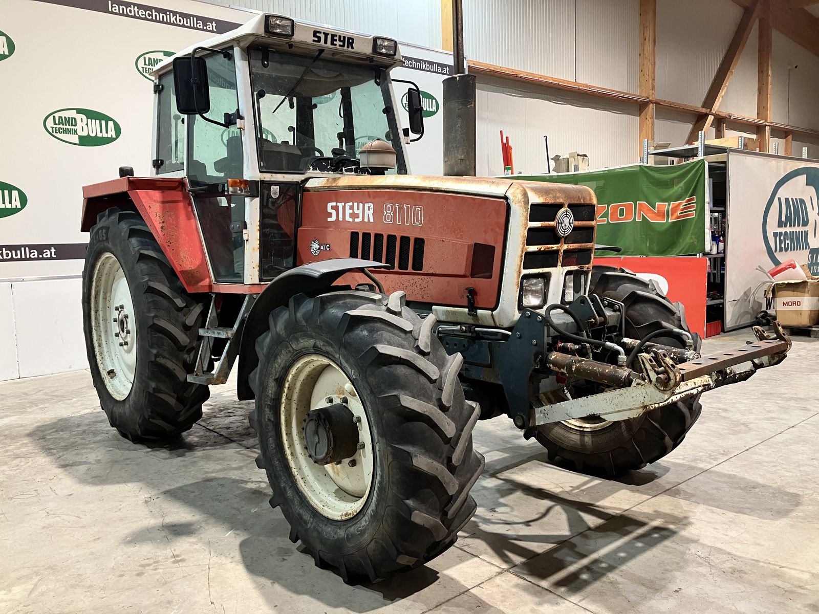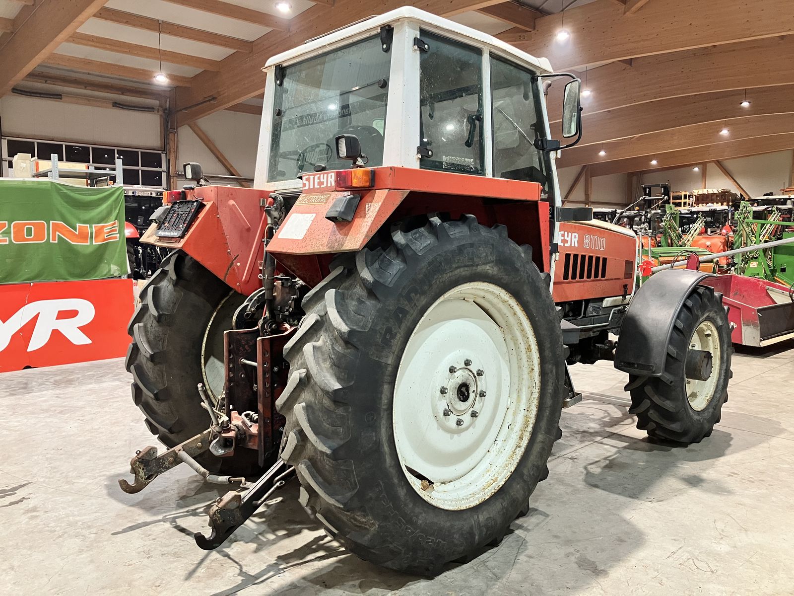STEYR 8110 A SK II + Bj. 1987, 9500 h + Lastschaltgetriebe + Kriechganggetriebe + Fronthubwerk mit Abstützung zur Mitte + Bereifung 14.9 R24 vorne und 16.9 R30 hinten + höhenverstellbare Anhängevorrichtung + EHR mit Zusatzhubzylinder + Tanschutzblech + Motorstaubremse + Luftsitz + SK 2 Kabine + 2x Arbeitsscheinwerfer hinten + Opti Stop Allradbremse