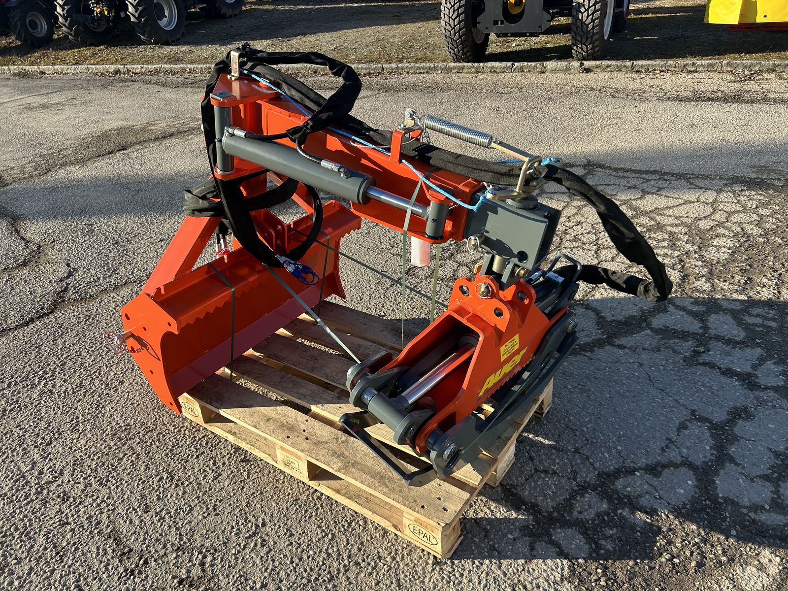 Dreipunkt-, Stapler- und Euro-Aufnahme serienmäßig + HYDRAULISCHE SPANNVORRICHTUNG + Hydraulisch kippbar, wahlweise links oder rechts + Vier Stützfüße Erdészet