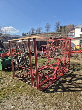 3-balkiger Grubber mit 3 Metern Arbeitsbreite, 10 Zinken, höhenverstellbares Scheibeneinebnungsfeld mit gezackten, gummigelagerten Scheiben, Flügelscharzinken, Feder