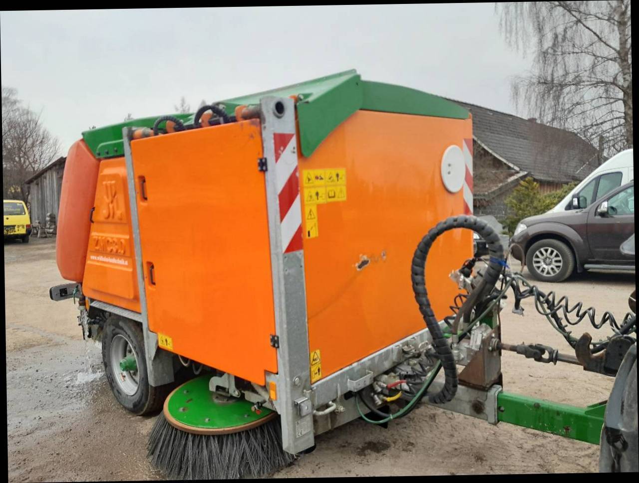 Tuchl Kehrmaschine 1, 6 m breit mit Seitenbesen, hydr. entleerbare Wanne, hydr. Schwenkung, 2 Tasträder, Beleuchtung, Hydraulikmotor für Zapfwellenstummel bei Bedarf.