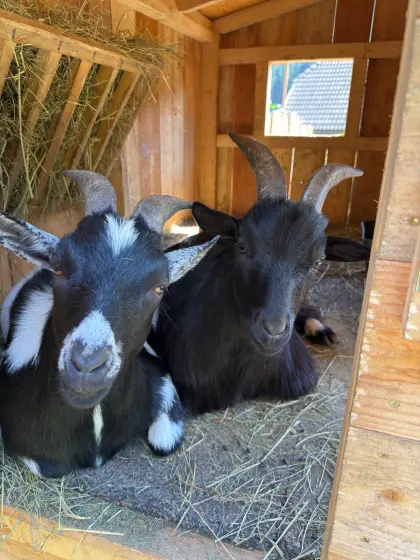 Hallo, aufgrund von geplanten Umbauarbeiten müssen wir uns leider von unseren 2 Zwergziegenböcken trennen. Beide sind sehr zutraulich und wirklich liebevolle Tiere.
