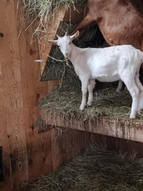 Zwei weibliche Ziegenkitze zum Abgeben, vom 7. bzw. 17. Juni 2025. Vater reinrassiger Saanen, Mütter Saanenmixe. Abgabe nur an Betriebe mit Betriebsnummer. Bevorzugt