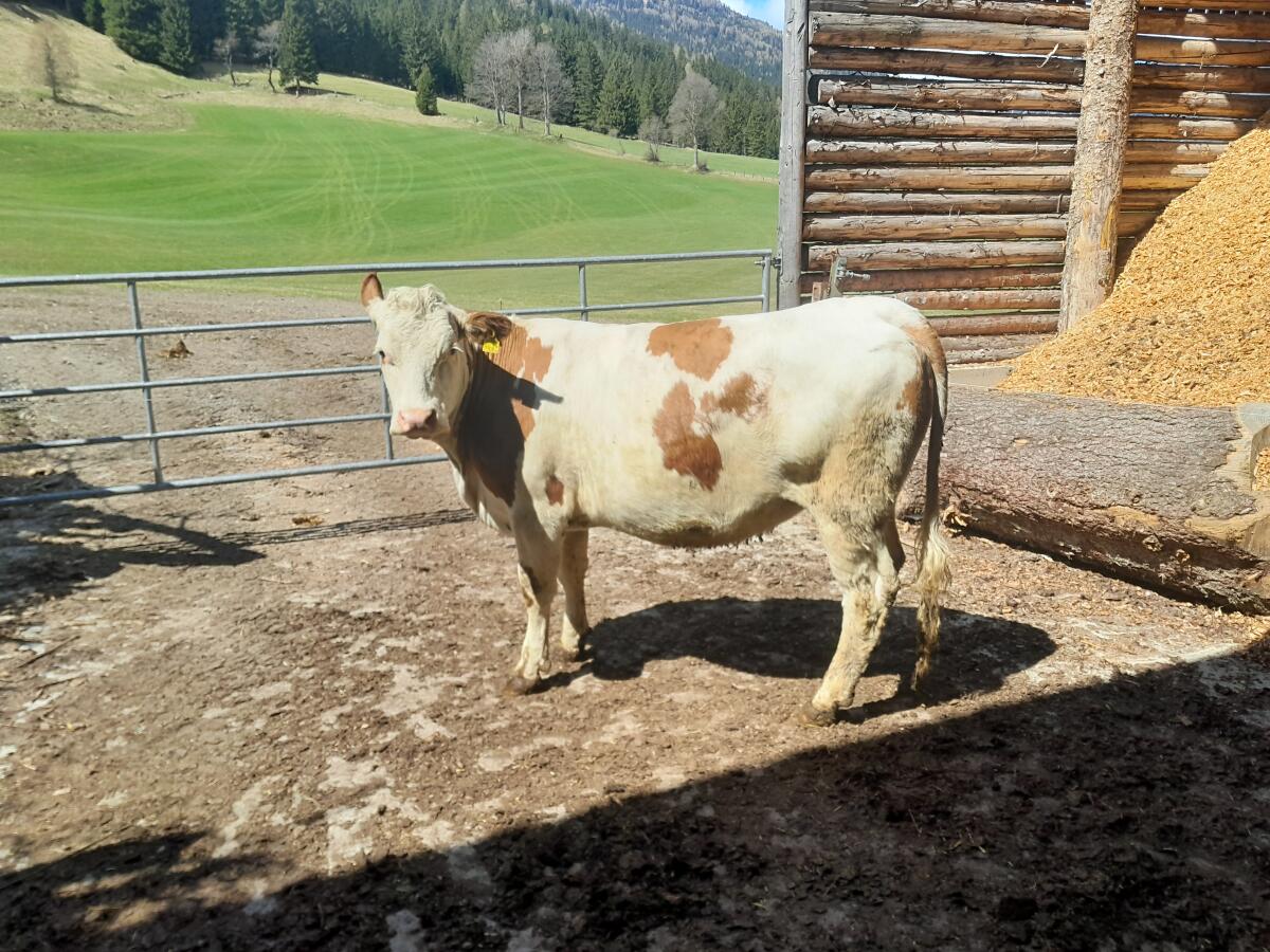 Biofleckviehkalbin, Geb: 2.2.2024, Hl: 7.000, 4.97, 3.2. Soll kalben: Ende Mai mit Weiß Blauer Belgier.