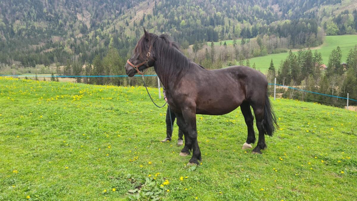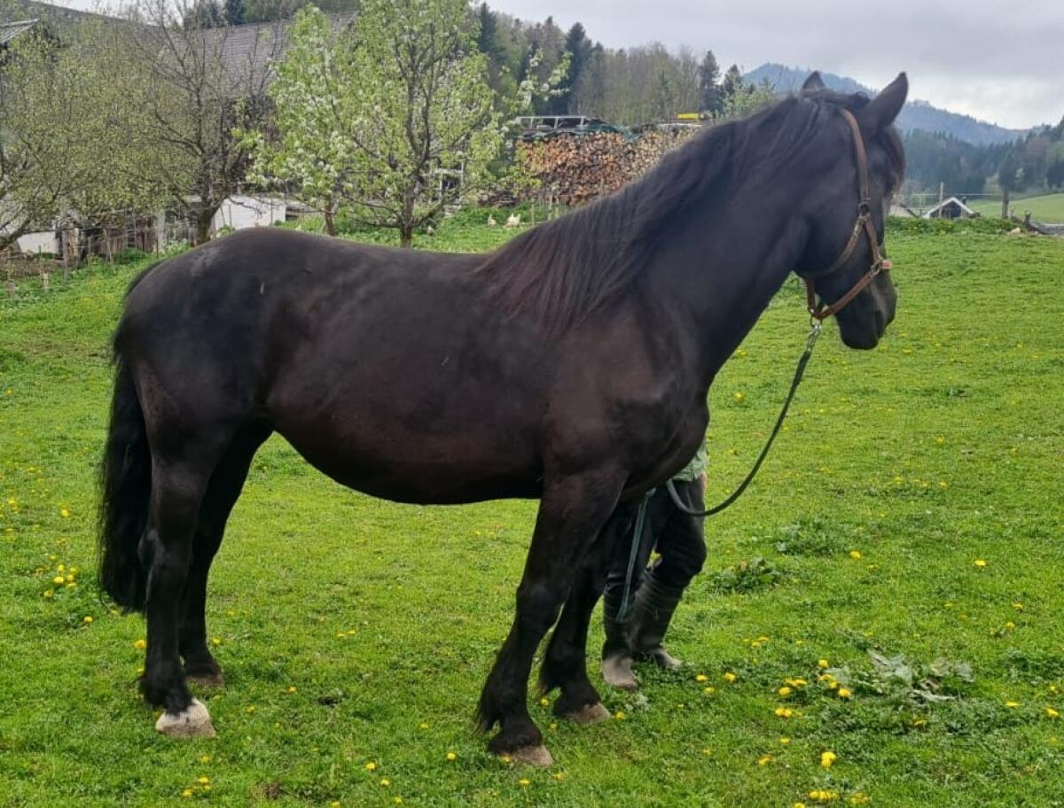 Sehr ruhige, lernwillige Stute mit einem Fohlen. Zurzeit nicht trächtig, im Stutbuch aufgenommen, einspännig gefahren, nicht geritten, aber mein Sohn sitzt manchmal drauf, der ist 11.
