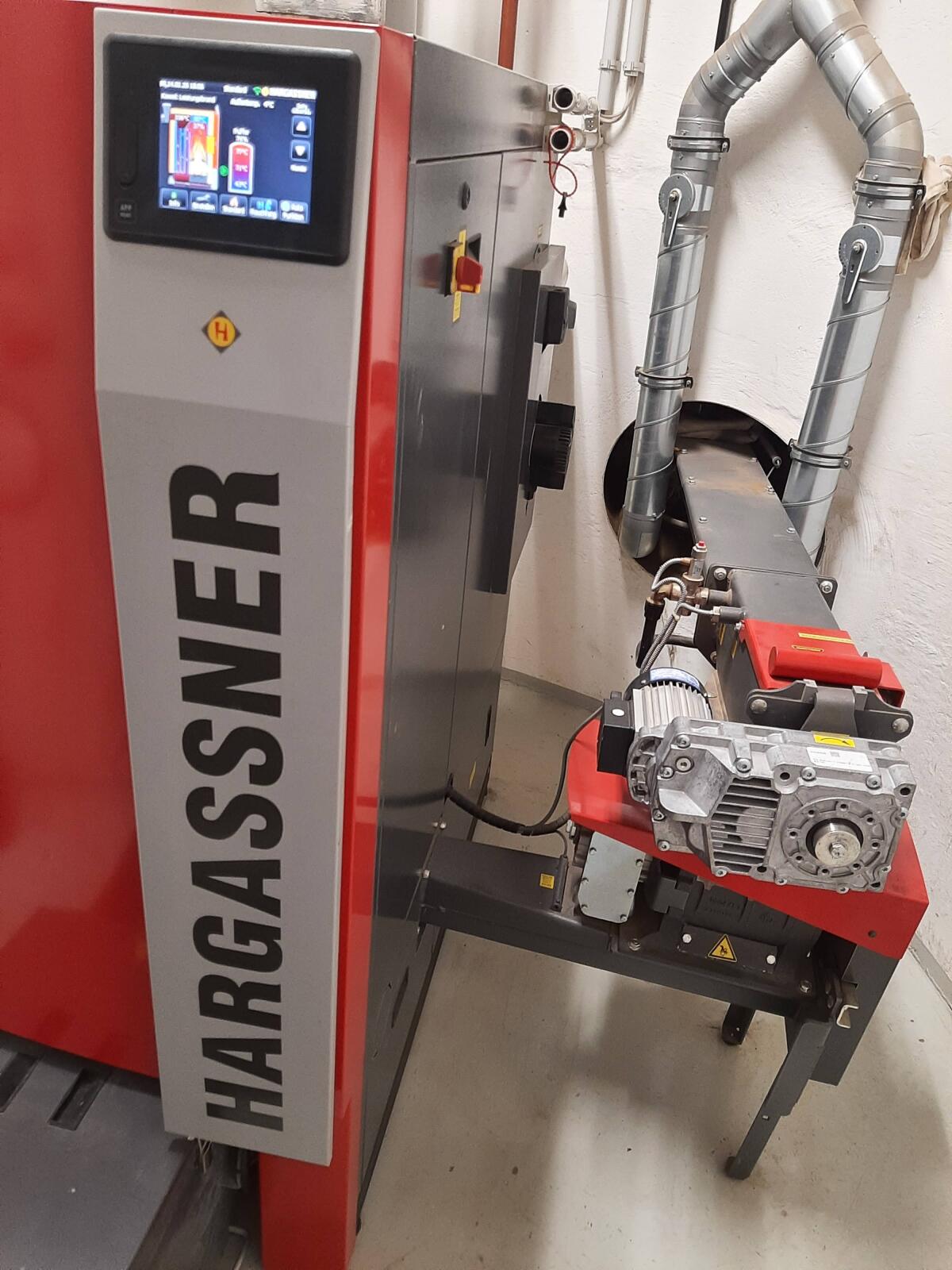 Durch den Ausbau des FW-Netzes wird eine leistungsstärkere Hackgutheizung eingebaut. Angeboten wird eine Hargassner Eco HK 65 Schnitzelheizung mit 65 kW (70 kW), Bj. 2015. Jährlich wurde ein Service der Fa. Heitzmann ausgeführt. Die Anlage läuft sehr zufriedenstellend ohne Störungen. Die Heizung ist in einem Top-Zustand, es wurde nur Hackschnitzel aus Stammholz verbrannt. Ohne RA und RH. Kein Fröling, ETA, Heizomat.