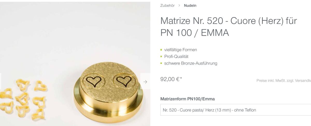 Zu verkaufen sind: 1x Matrize Nr. 520 - Cuore (Herz) für PN 100 / EMMA, 1x Matrize Nr. 50 a - Conchiglie (Muscheln) groß für PN 100 / EMMA. Verkaufpreis je Matritze € 55,-. Versand möglich.