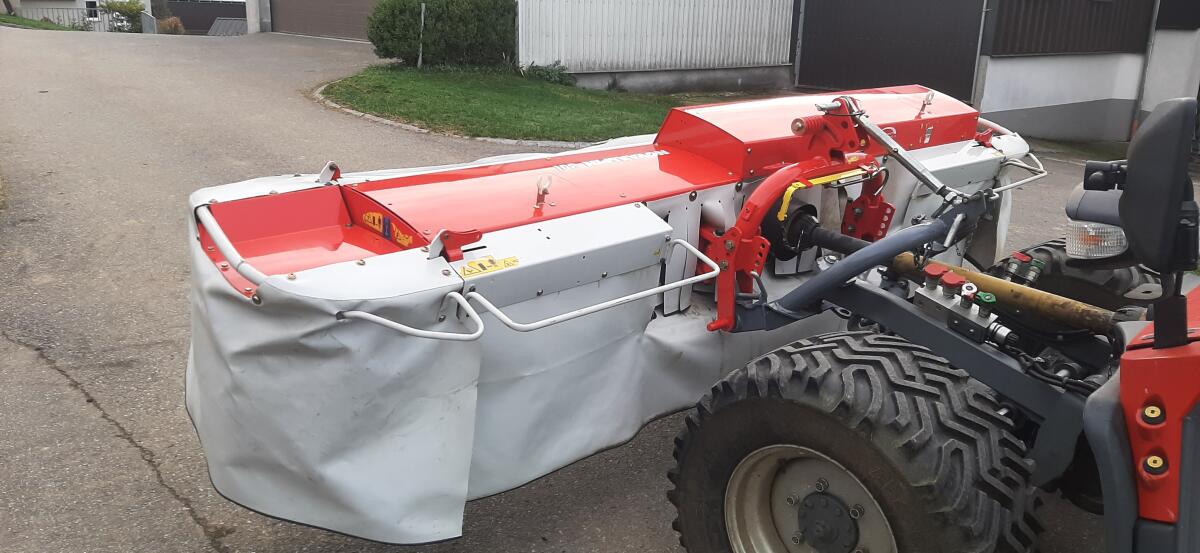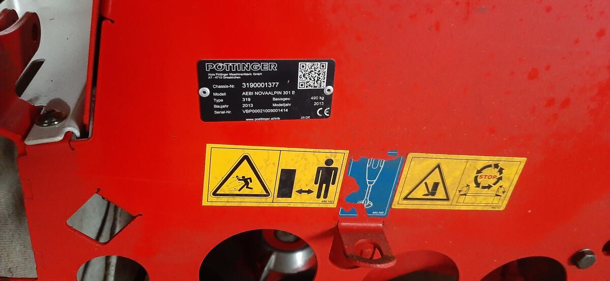 Pöttinger Nova Alpin 301 mit Anbaubock B (Mähtrack), Bj. 2013, ging aber erst 2015 in Betrieb. Antriebsart linksdrehend für Aebi, 1.000 U/min, Verschleißkufen, Zusatzschwadtrommel für Schwadablage, neuwertig dabei, aber nicht montiert, Gelenkwelle.