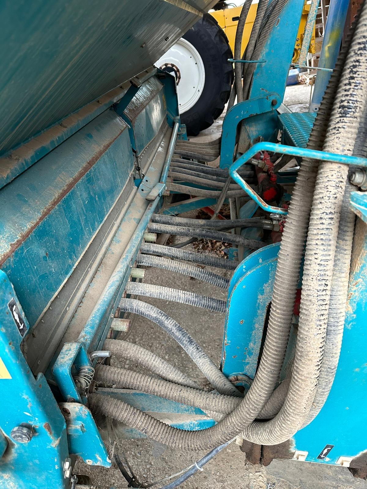 Sulky Drillmaschine, 6 m mit neuwertigen Schleppscharen, 3-Punktanbau, große Füllmenge, ca. 1.500 kg, mit hydr. Antrieb, mit Striegel, für schwere Böden geeignet.