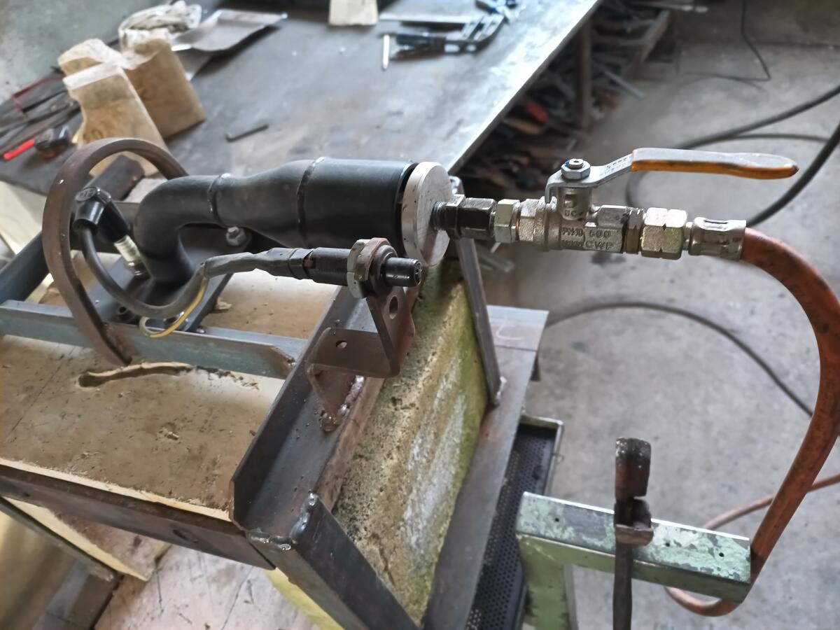 Schmiedeofen, Propangas, Leistung am Brenner und Druckregler regelbar, Brennraum 200x190x280, freier Durchgang für sperrige Werkstücke, mit Schamottauskleidung.