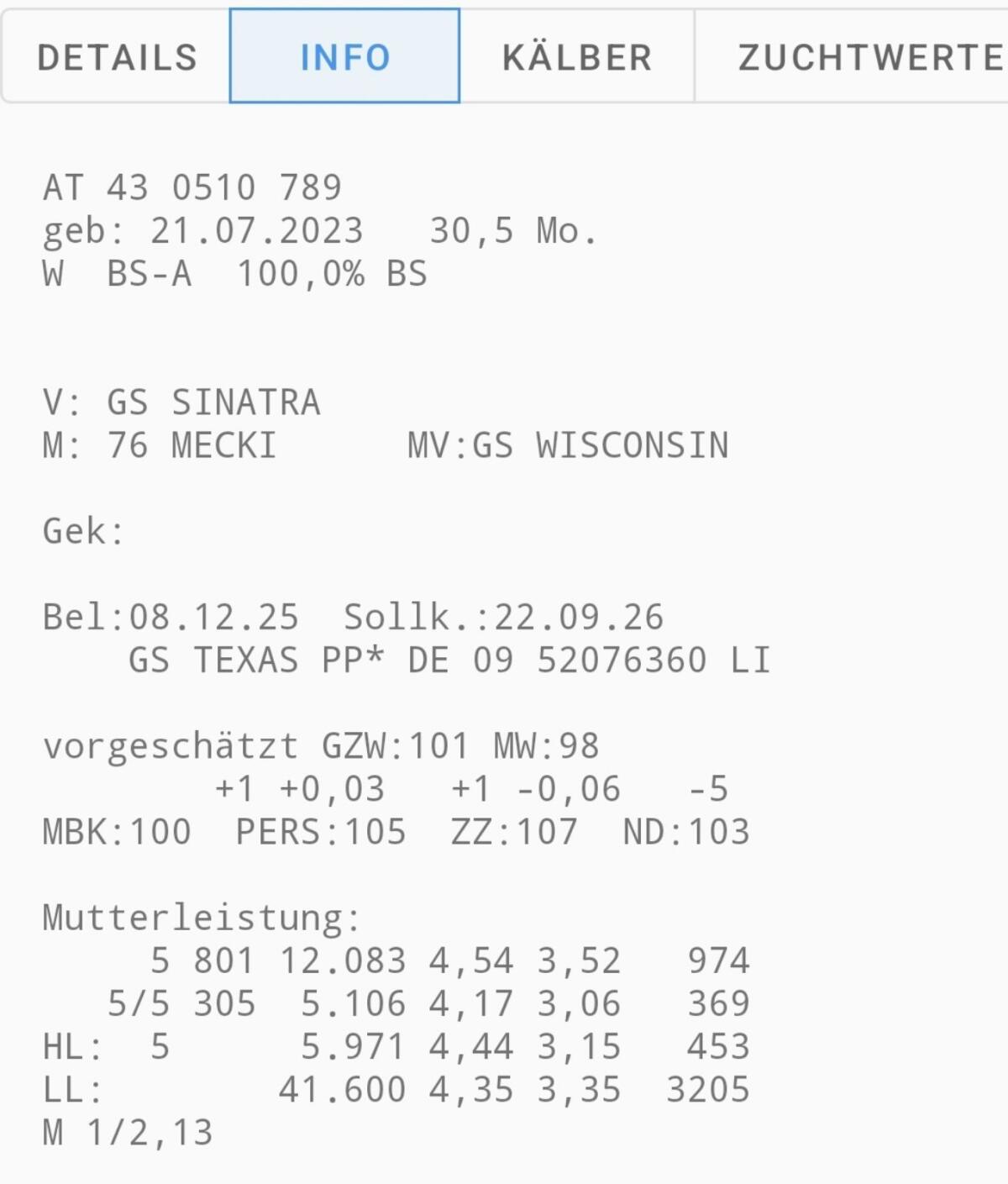 Habe eine schöne große Bio Braunviehkalbin abzugeben. Ist enthornt und mit Texas PP (Limo) belegt. Die Mutter hat ohne KF fast 6.000 kg HL gemolken. Aufgrund von zweimaliger Alpung erst spät belegt.