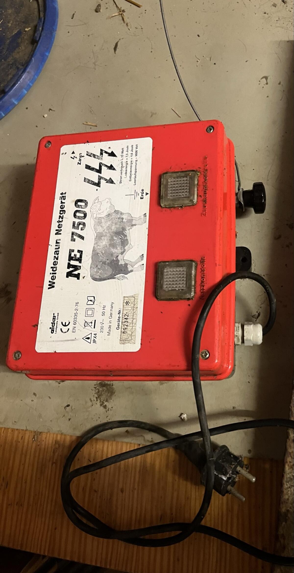 Ich verkaufe ein Weidezaungerät NE7500. Die Stromstärke ist 230 V-50 Hz, Stromverbrauch: 10 Watt, Ladeenergie: 7,5 Joule, Leerlaufspannung: 9.000 Volt, Entladeenergie: 4,6 Joule. Es funktioniert, wurde lange nicht benutzt.