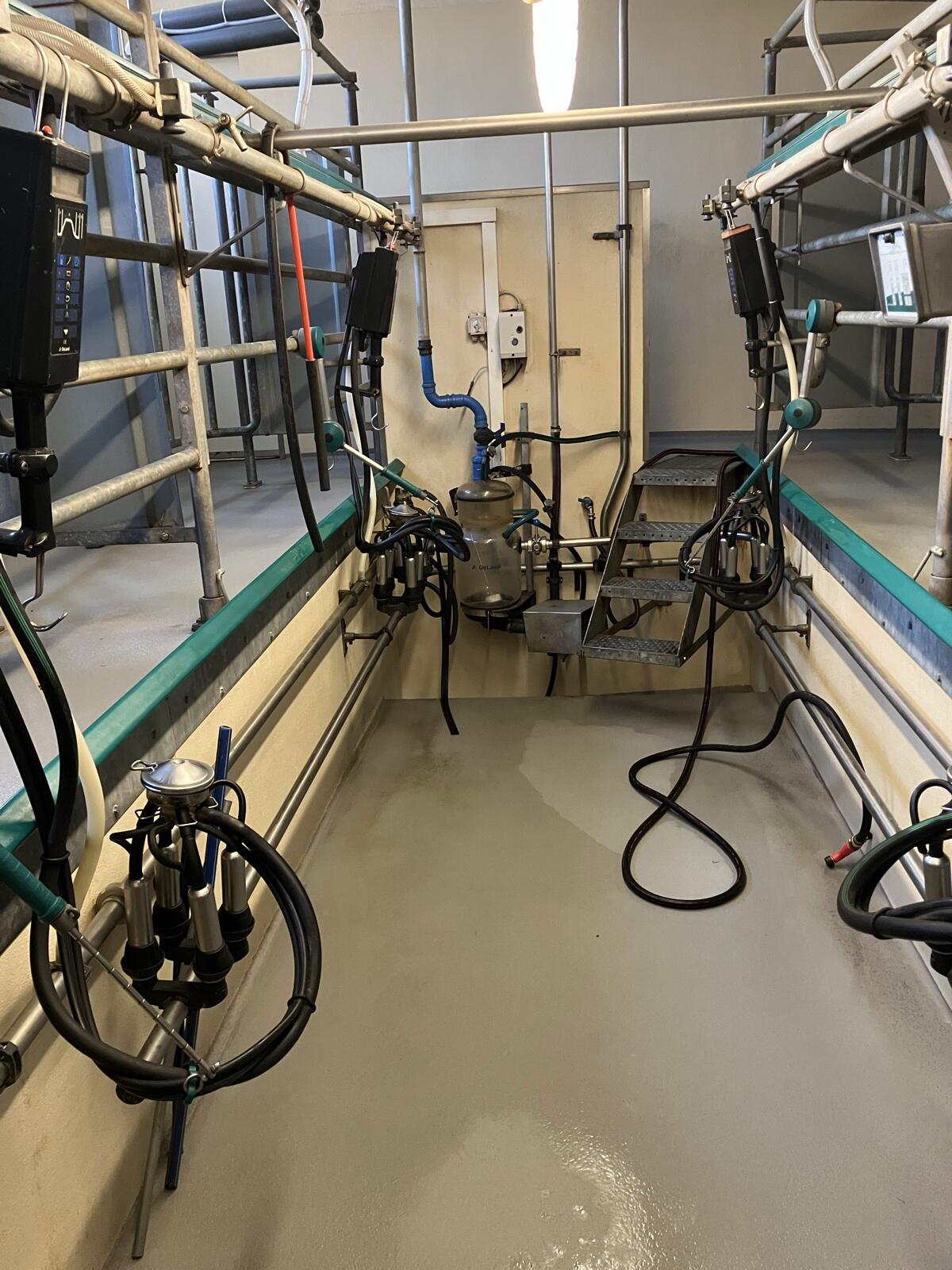 Tandemmelkstand komplett, mit allen Pumpen, Motoren und Steuerungen, betriebsbereit. Für 4 Melkplätze, mit Waschautomat. Automatische Eintriebs- und Austriebssteueru