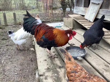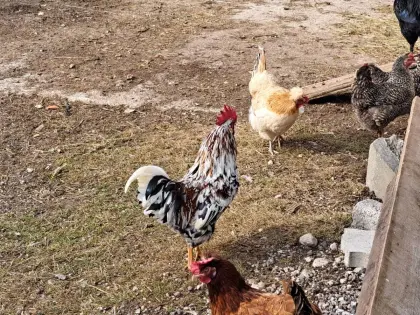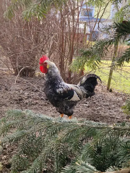 Wir vergeben unseren Hahn aus Naturbrut vom August 2025. Er ist mit großem Auslauf aufgewachsen und umgeimpft. Er ist ein Mischling, vermutlich mit Sperber-Anteil. W