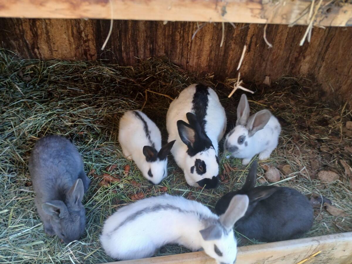 Unsere jungen Kaninchen suchen ein neues Zuhause. Sie sind am 24. Mai 2025 geboren und Mischlinge aus deutscher Riesenschecke und Rex-Kaninchen. Unter dem bunten Wur