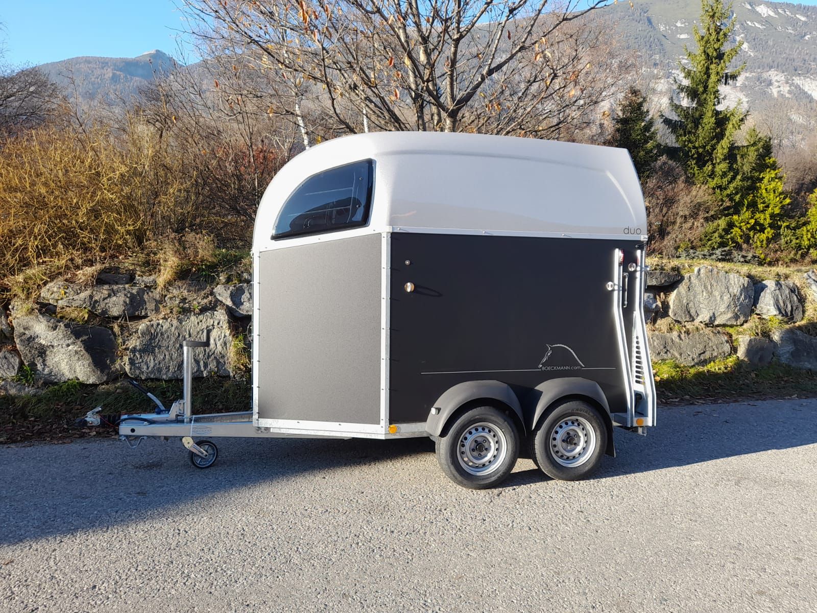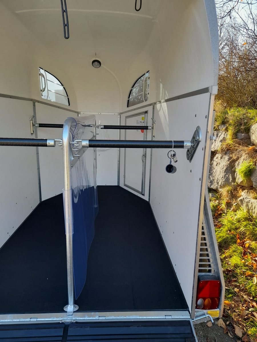 Pferdeanhänger Duo C für 2 Großpferde + Aluminiumboden + Vorbereitung für Videoüberwachungsanlage & Rückfahrkamera + Hinterklappe /1-Flügeltür (Schwenktür) + keine Sattelkammer Maße : 3050,00x1650,00x2300,00 mm Zulässiges Gesamtgewicht 2,40 t Einzelradkotflügel, Kunststoff schwarz PVC-Klarsichttrennwand (Stm. 165) Multi Safe System (Sicherheitsboxenstangensystem) Stützrad automatik Innenbeleuchtung 2 Seitenstreben Gummiboden verklebt und versiegelt Bordwände anthrazit 1500 mm 4 Hinterklappen-Scharniere Gummi auf Hinterklappe (integrierte Trittleisten) Planenlift mit integriertem Netz CFF-Plus Fahrgestell inkl. Radstoßdämpfer Dekorstreifen Design "Künster" Polyesterhaube silber-metallic
