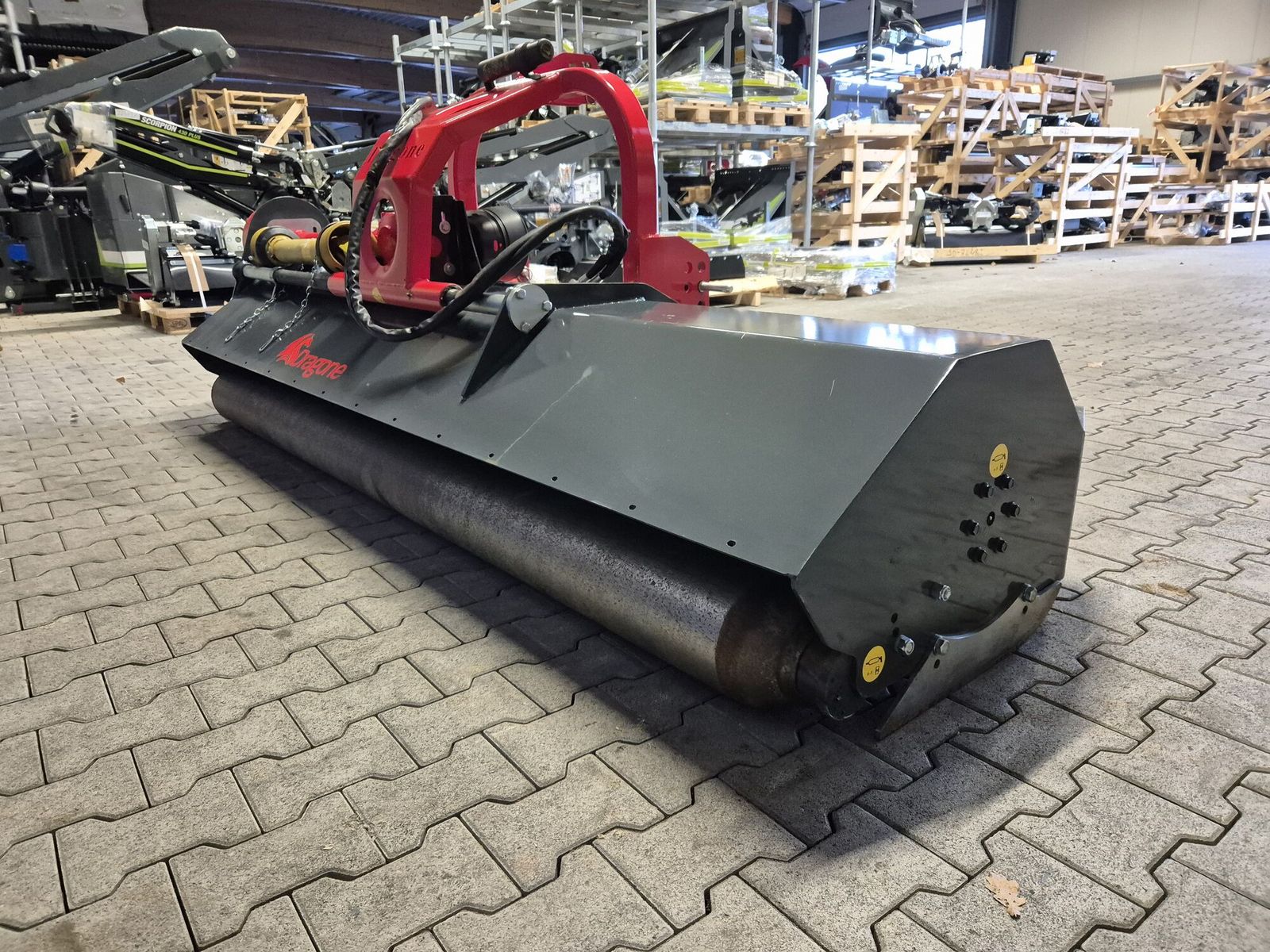 Mulchgehäuse in grauer Farbe / Dreipunktbock in roter Farbe