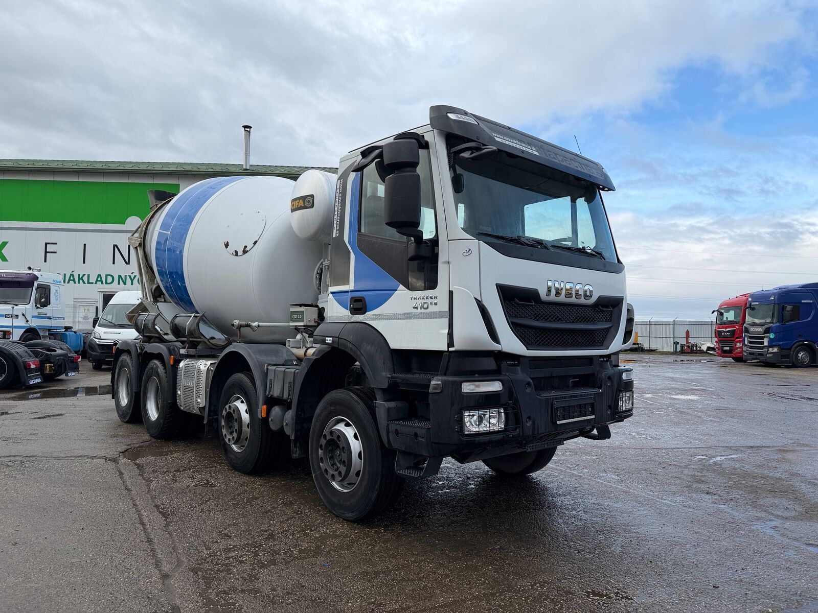 IVECO TRAKKER 410 8X4 domiešavač 10 m3 r.v. 03/2018, 151519 km, EURO 6, 12882 cm3, 302 kW, manuálna prevodovka, motorová brzda, klimatizácia, pohon bubna - hydromotor, prvé dve nápravy natáčacie, 2 miesta na sedenie, váha- 15.240 kg, celková hmotnosť- 41.000 kg, stav pneumatík 4x90% 4x40% 4x10% vozidlo má zahraničný TP