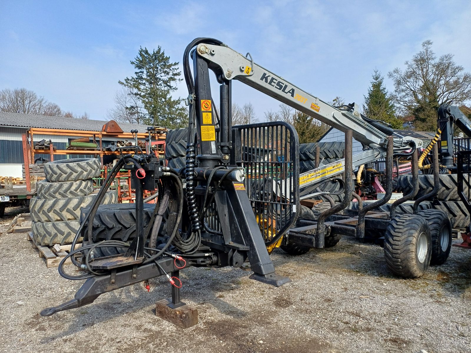 Kesla 9T + 203T - Zentralrahmenanhänger, Lenkdeichsel, 4 Rungenpaare, hydr. 2-Rad Bremse, Brennholzösen, Bereifung: 400/60x15,5 Mitas, L- Kran 6,7 m Reichweite, Zange 0,18, A-Stützen, Einfachteleskop, Endlosrotator, Hubzylinderschutz, Untenanhängung ca. 45 cm.