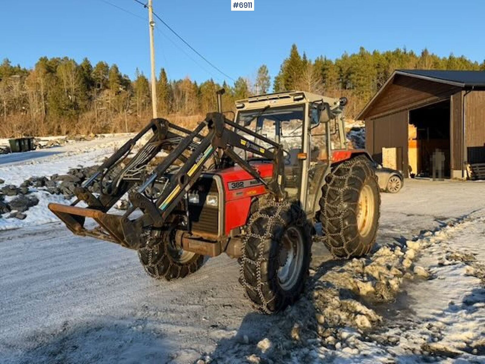== Mer informasjon (NO) == mascus_category: tractors Please provide reference number upon request: 6911 See en.landbrukssalg.no/6911 for more images Specifications Hours: approx.5200 Cover 50% (see pictures) Front tire size 360/70R24 Rear tire size 18.4R30 Top blow behind the follower Chains follow Trima front loader Kerb weight 3,155kg Max payload 4,306kg 2 double outlets at the back Air conditioning/AC Engine heater Two new batteries Ready for delivery Description Massey-Fergusson 382 4x4 w/front loader from 1995 Owner has owned it since 2012. Clutch replaced in 2019. Two new batteries just installed. Rear top link and chains included Can be delivered within a short time