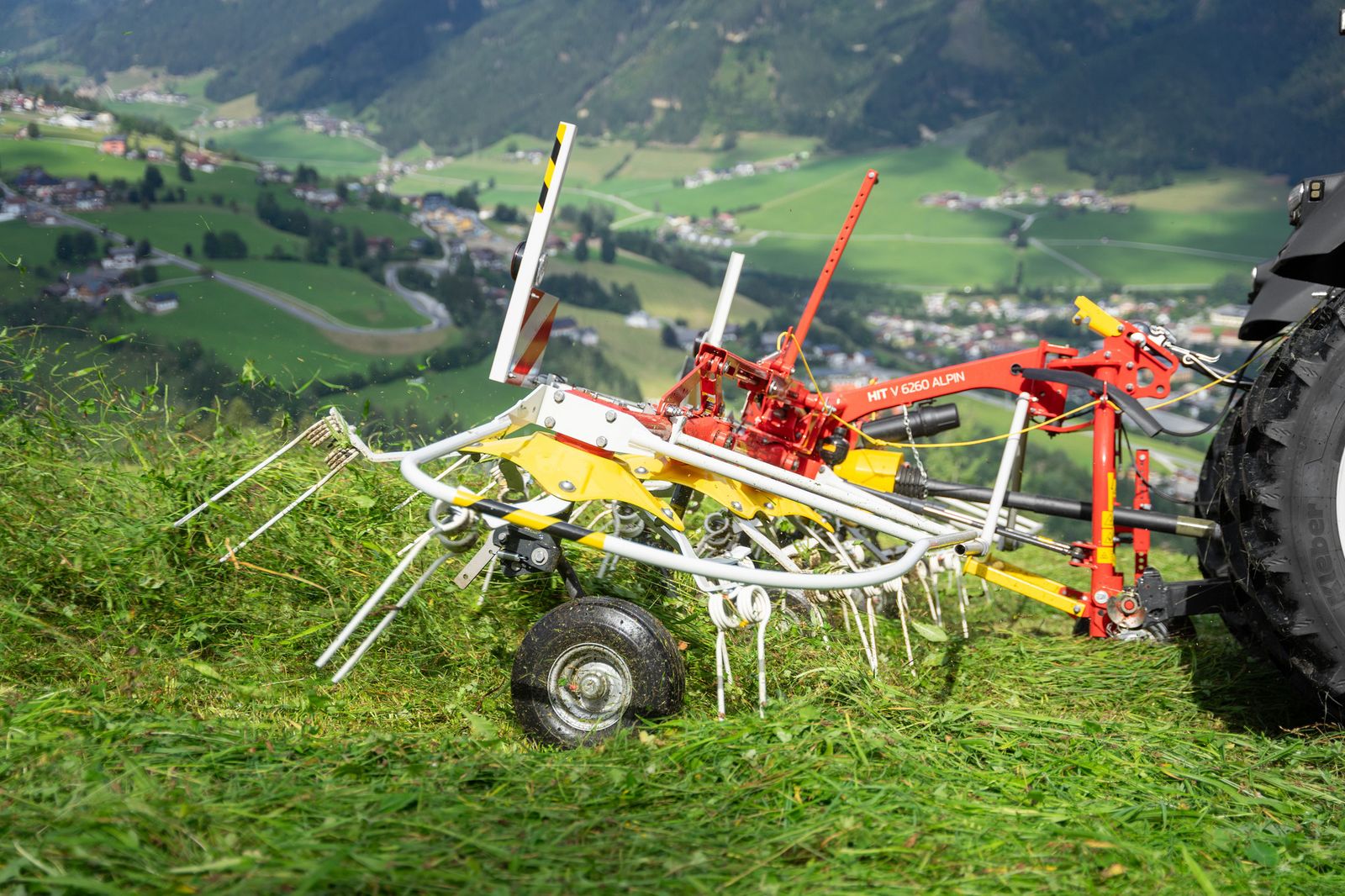 neuer Pöttinger Kreiselheuer HIT V 6260 ALPIN inkl. Gelenkwelle Antrieb 540 U/min Hydraulischer Zentrierzylinder Ausrüstung PÖTTINGER Unterlenkerkonsole Kat. 2 Hydrolift Oberlenkerkonsole obenliegend Tastrad 16 x 6,5-8 Arbeitsbreite: 6,2m Eigengewicht: 530kg