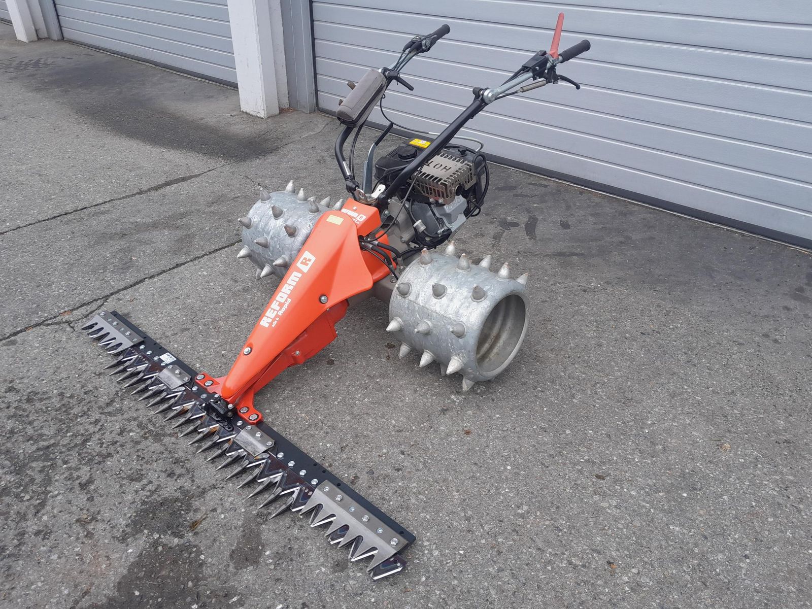 1 Reform Motech RM 7.07 mit Subaru Robin EX 21, OHV 1 Paar BR 16 x 6.50-8 Ackerstollen-Bereifung, Einpresstiefe 25 mm -> Stachelräder gegen Aufpreis erhältlich! 1 Messerantrieb, im Ölbad gelagert, mit Überlastsicherung, Hub 94 mm, 12° 1 Mittelschnittbalken 160 cm mit Seitenschneidwerk Seitenschneidwerk (links + rechts) Fingerabstand 2' / 50,8 mm 1 Drehgriffbremse