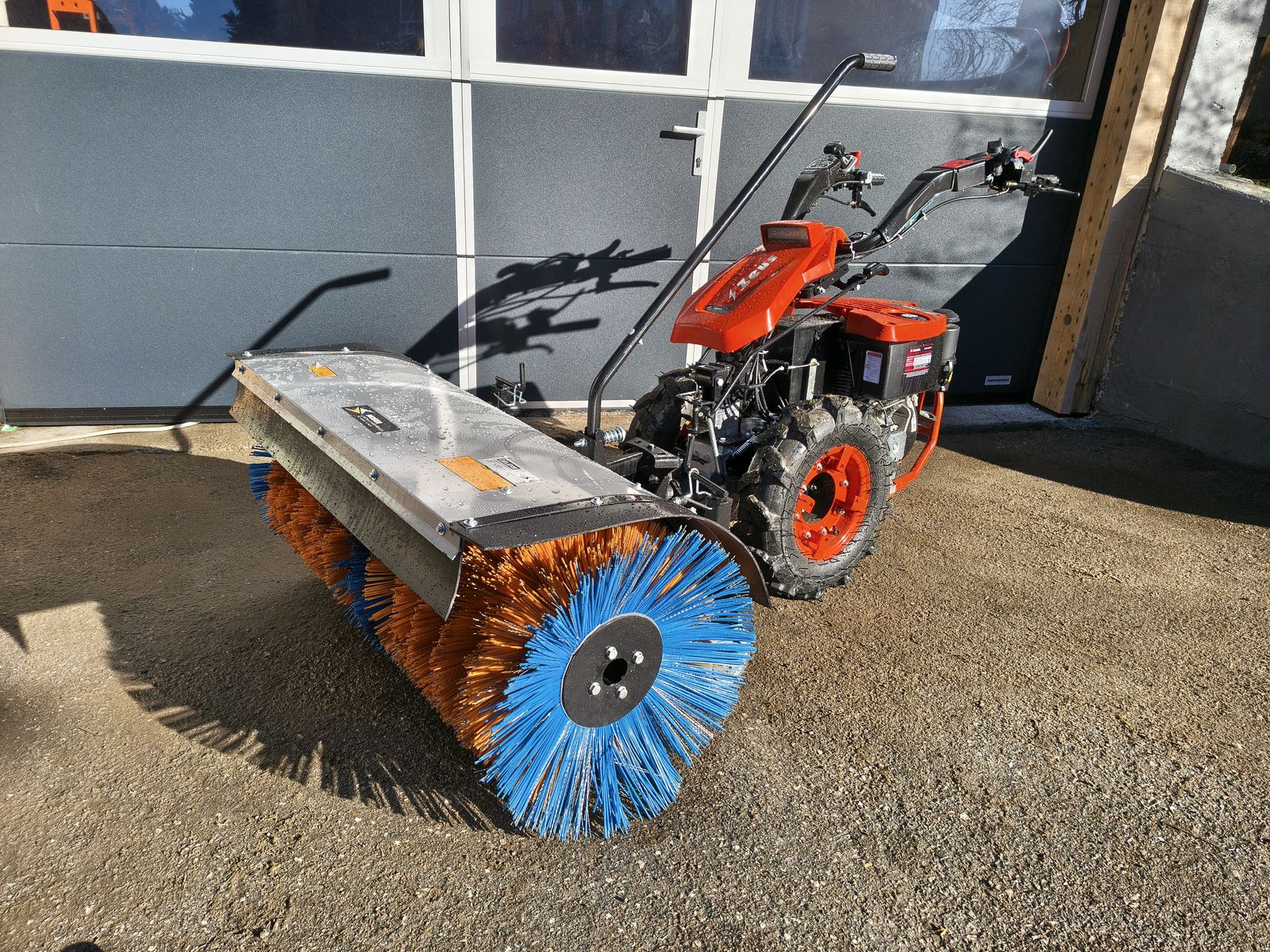 Einachstraktor ZEUS – 418 cc Diesel, 3+2 Gänge Der ZEUS Einachstraktor von DELEKS ist ein professioneller Einachser für Landwirtschaft, Gartenbau, Obst- und Weinbau sowie anspruchsvolle Privatnutzer. Ideal für Bodenbearbeitung, Mähen, Schneeräumung und Reinigungsarbeiten – vielseitig einsetzbar mit optionalem Zubehör. Ausgestattet mit einem Kama 418 cc Dieselmotor (Elektrostart + Seilzug) und 3+2-Gang-Getriebe mit Schnellwechselsystem. Dank Differential mit Sperre bietet der ZEUS hohe Wendigkeit und optimale Traktion auch an Hängen. Der umkehrbare, höhen- und seitlich verstellbare Lenker ermöglicht den Einsatz von Front- und Heckanbaugeräten. Technische Daten: * weibliche Schnellkupplung * Motor: Kama 186FA, 418 cc Diesel, 9 PS (auch günstiger Benzinmotor möglich) * Start: Elektrostart & Seilzug * Getriebe: 3 Vorwärts- / 2 Rückwärtsgänge * Geschwindigkeit: 1,5 – 3,0 – 11,2 km/h * Gewicht: 130 kg (Grundgerät) * Drehzahl: 990 U/min * Kehrmaschine 1m * Arbeitsbreite: 100 cm * Gesamthöhe: 60 cm * Bürstendurchmesser: 50 cm * Ölbad-Zahnradantrieb * Hinterräder für Lenkung und Arbeitshöheneinstellung Auf den Bilder sind auch zusätzliche (nicht im Preis inbegriffene) Anbaugeräte abgebildet. Der vielseitige Deleks Zeus kann mit vielen Anbaugeräten geliefert werden: * Mähbalken * Bodenfräse * Mulcher * Anhänger * Schneeschild * Schneefräse * Sämaschine * Pflug * Kehrmaschine * Kartoffelhäufler * Grubber * Rotationspflug * Kreiselegge * Sichelmäher * Umkehrfräse * Fahrersitz * Raupenantrieb * Diesel oder Benzinmotor