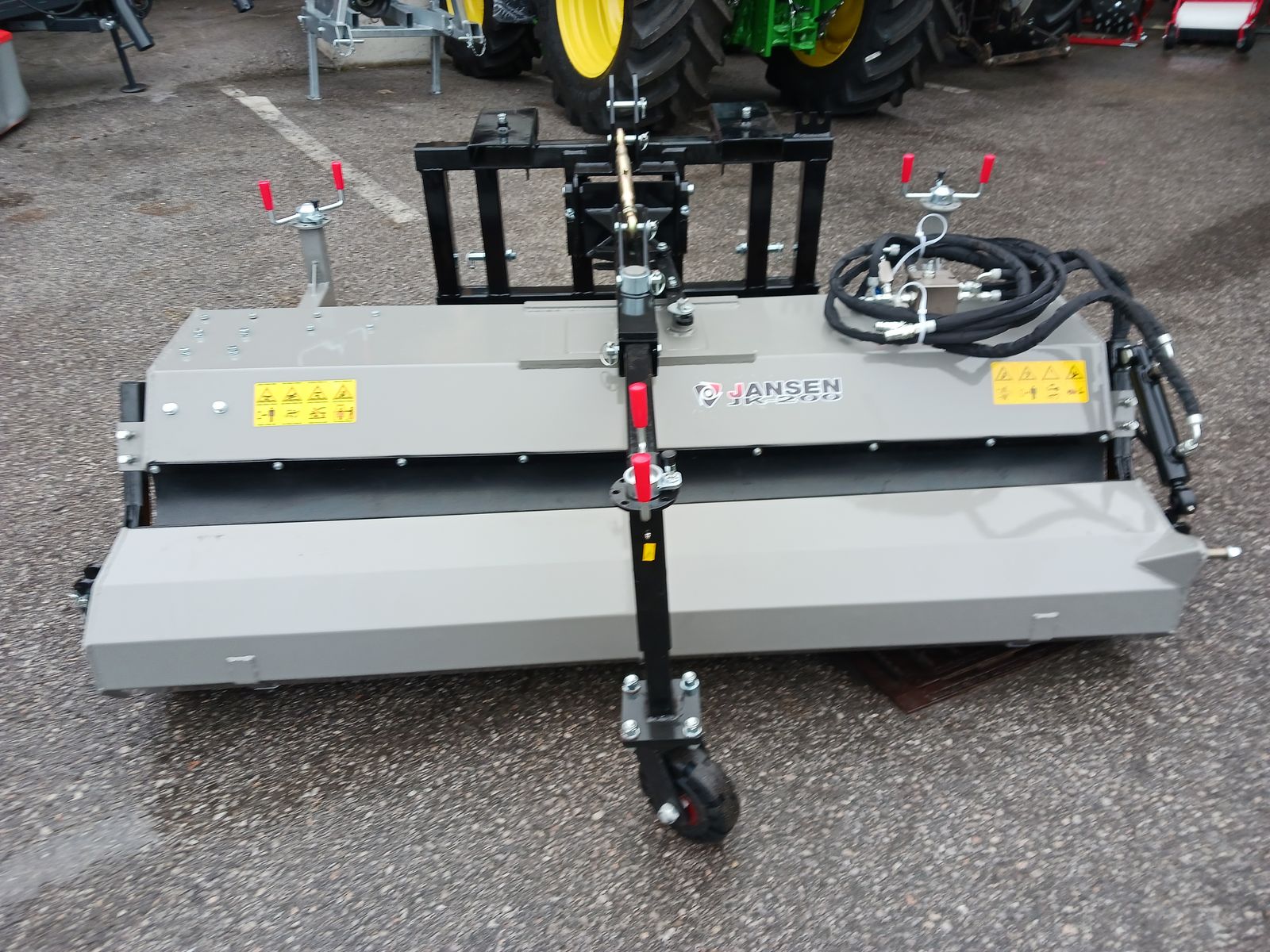 Arbeitsbreite 200 cm Gesamtbreite 234 cm Aufnahme: Euroaufnahme, KAT.1+2 und Palettengabel Anbau für Traktoren, Stapler, Radlader und Hoftracs Durchmesser Kehrwalze 48 cm Kehrwalze und Bürsten mit Kunststoffbesatz Leistungsstarker Hydraulikmotor Förderleistung: min. 20L/Min. Betrieb mit nur einem doppeltwirkenden Steuergerät Manuell schwenkbares Chassis (20° links und rechts) Schmutzsammelwanne aus 4 mm Stahl mit ca. 160 Liter Volumen Stufenlos höhenverstellbarer Schmutzbehälter Hydraulische Behälterentleerung 3 stufenlos höhenverstellbare Stützräder (200 mm Vollgummi) Arretierbare Kurbel der Stützräder Horizontaler und vertikaler Niveauausgleich (Schwimmstellung) Spritzschutz Gewicht: ca. 330 kg