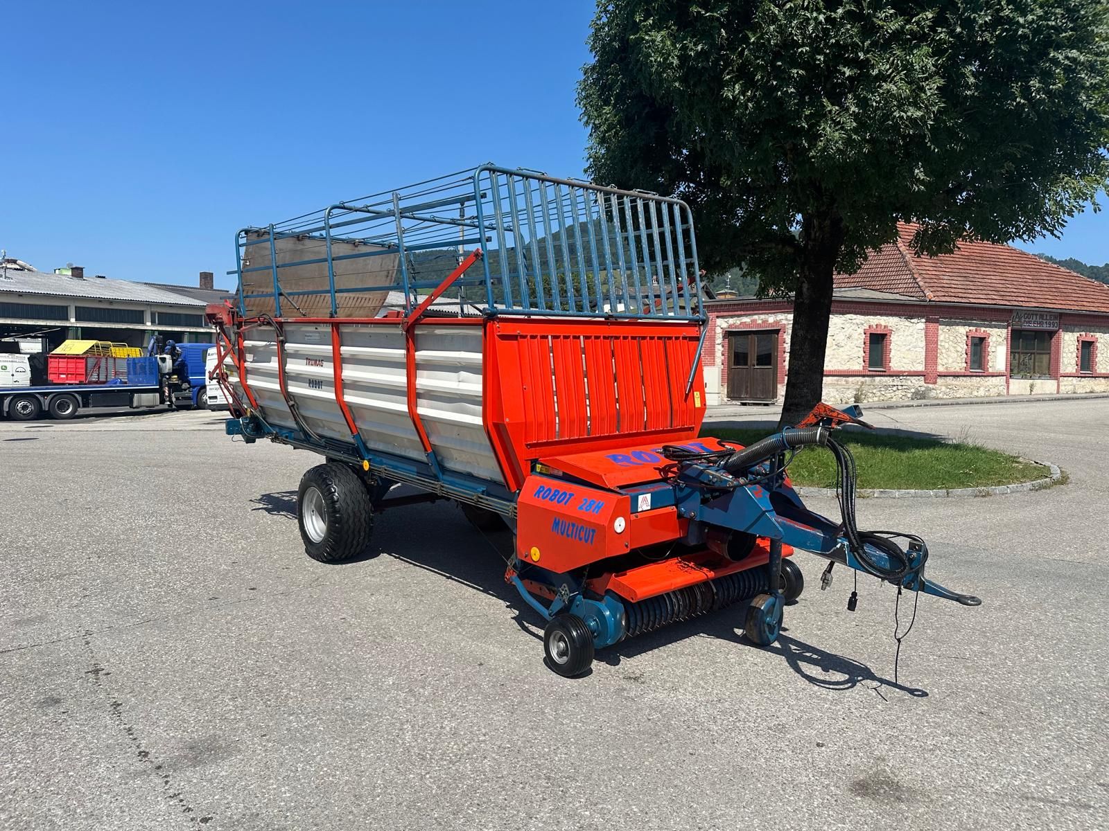 +Knickdeichsel +22. Messer +hyd. Kratzboden Der Trumag Robot 28 H ist ein Kurzschnitt-Ladewagen mit ca. 28 m³ Volumen, konzipiert als robuster Hoch- oder Tieflader für hügeliges Gelände. Er zeichnet sich durch ein geringes Eigengewicht, bis zu 22 Messer für sauberen Schnitt und eine hydraulisch höhen- und querpendelnde Pick-up aus.